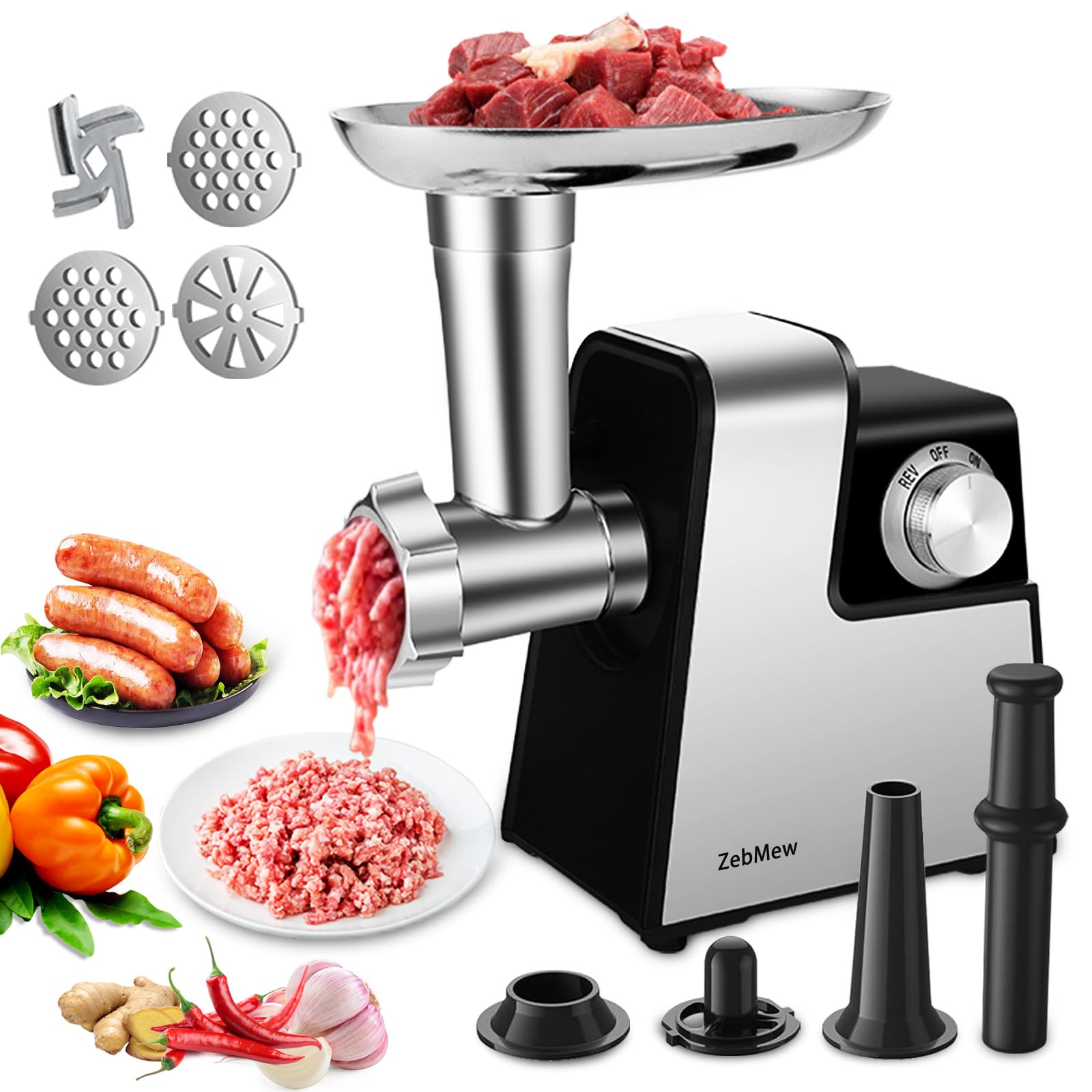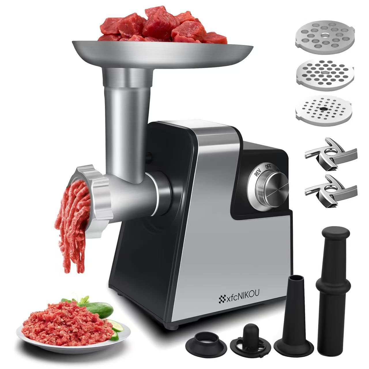 Picadora de carne eléctrica, relleno de salchichas máximo de 2800 W, picadora de carne de acero inoxidable con 2 cuchillas, 3 plat