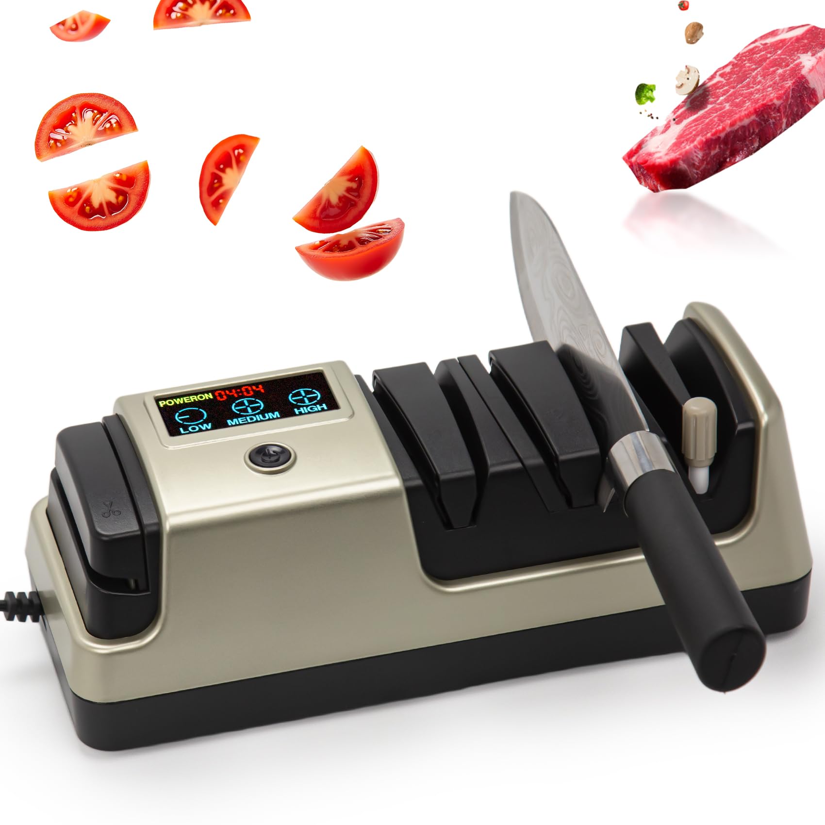 Afilador de cuchillos eléctrico 5 en 1 rubio claro con pantalla LCD para cuchillos de cocina, afilador de cuchillos eléctrico de 3