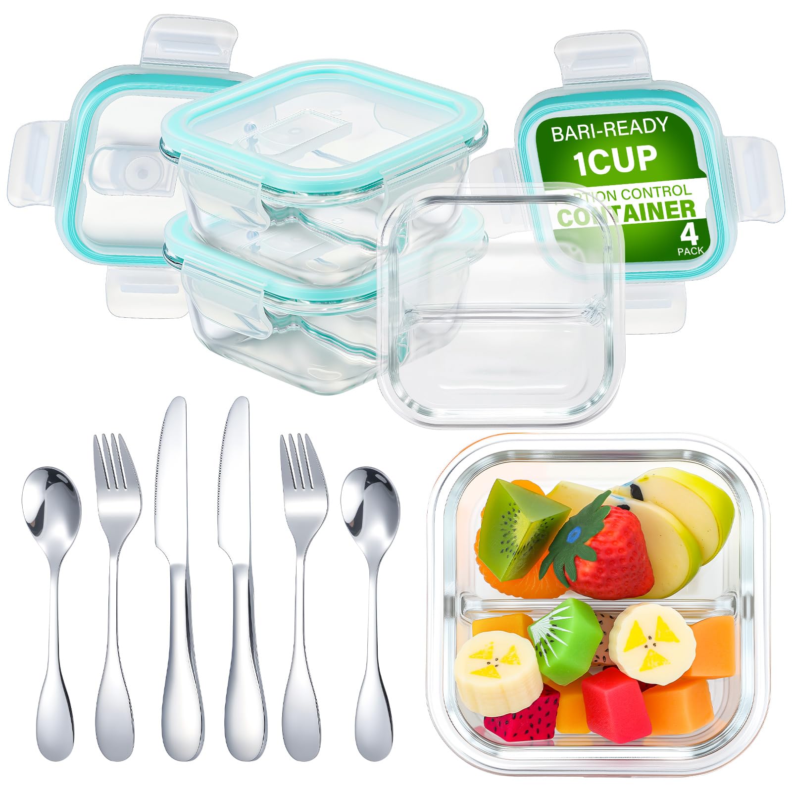 Paquete de 4 recipientes bariátricos de vidrio para control de porciones con tapas y 4 cuchillos, tenedores, cucharas, juego de cu