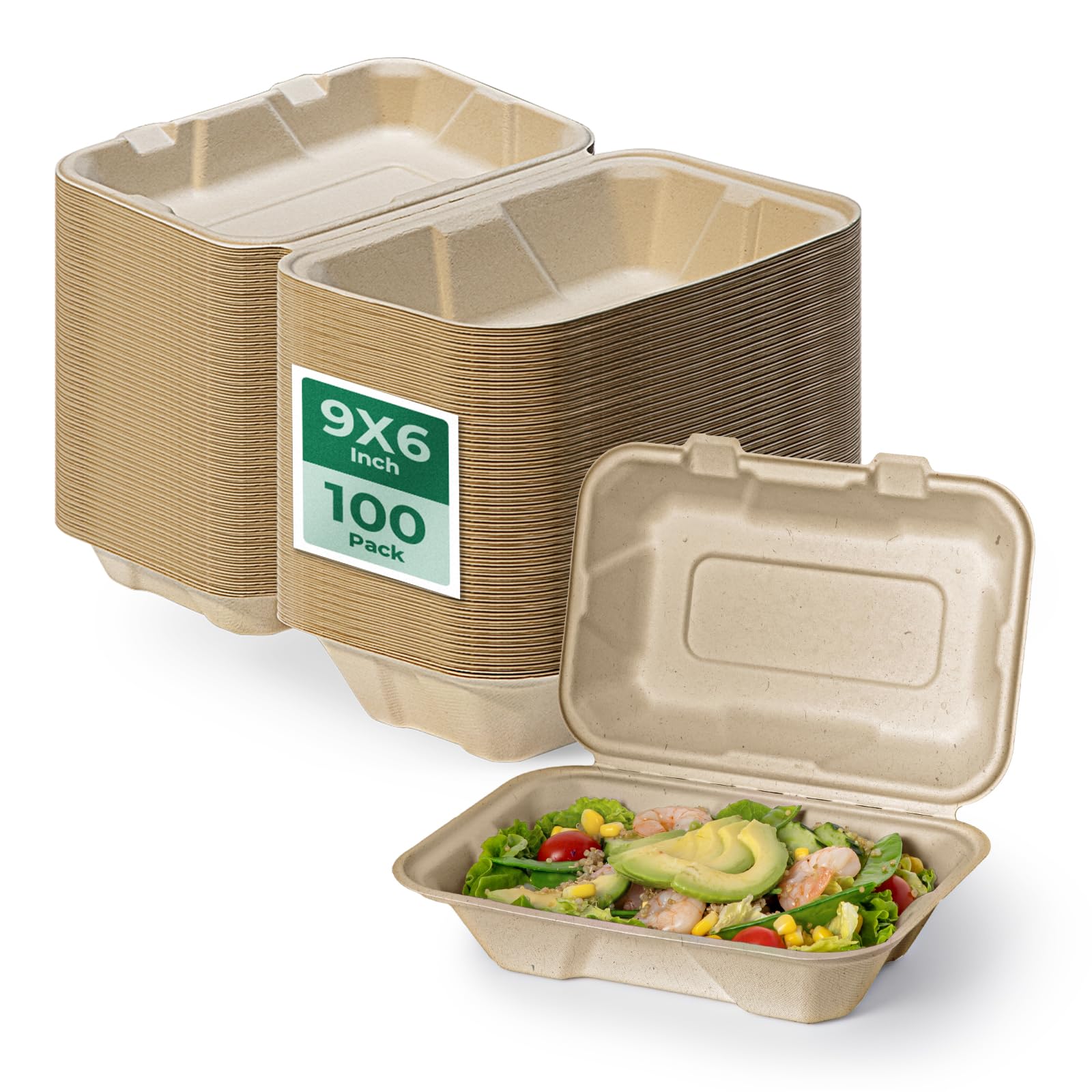 Fit Meal Prep Paquete de 100 contenedores de alimentos compostables de 9 x 6 pulgadas, cajas desechables para llevar, cajas de pap