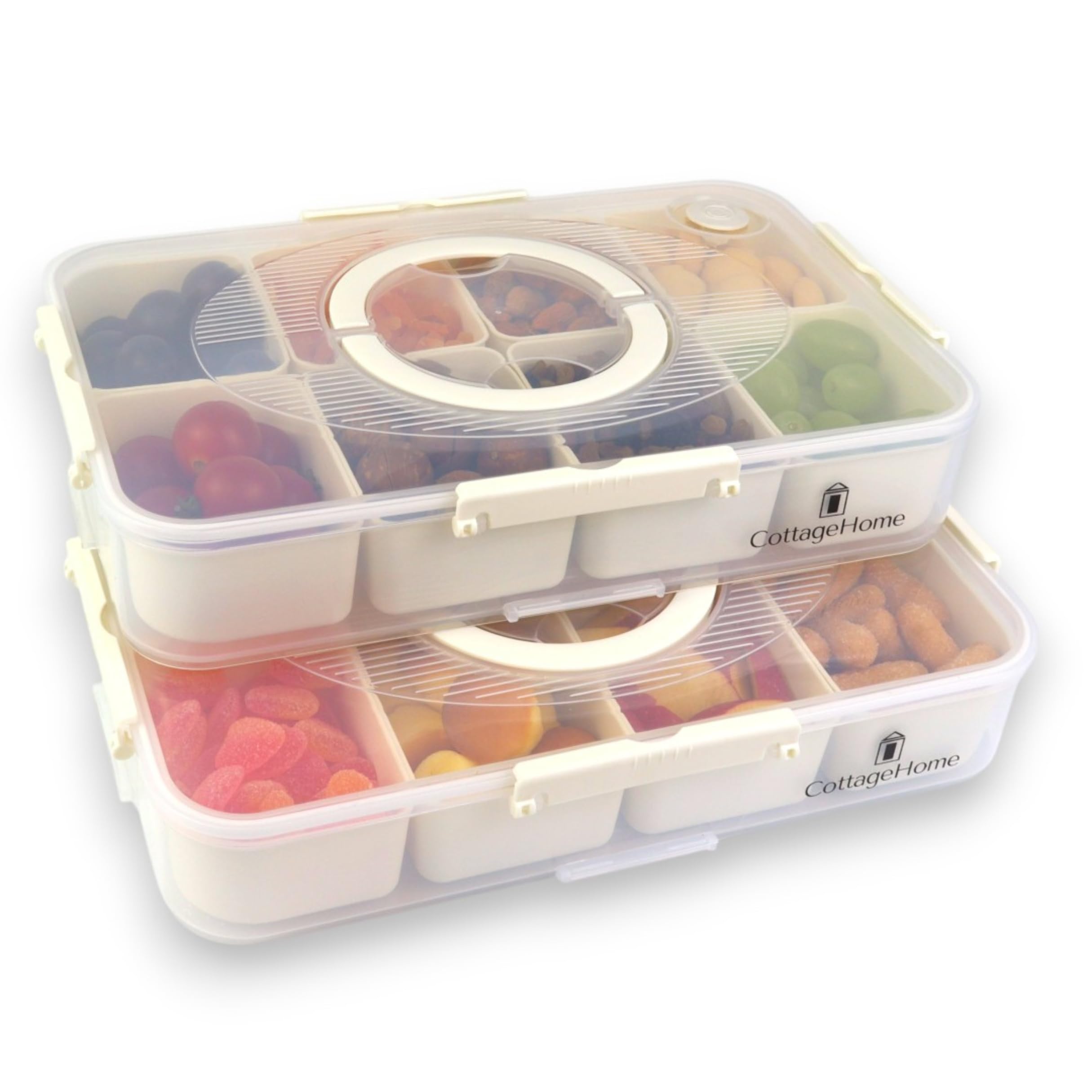 Snackle Box – Paquete de 2 bandejas divisorias para servir con tapa y asas, 8 recipientes para embutidos para frutas, nueces, aper