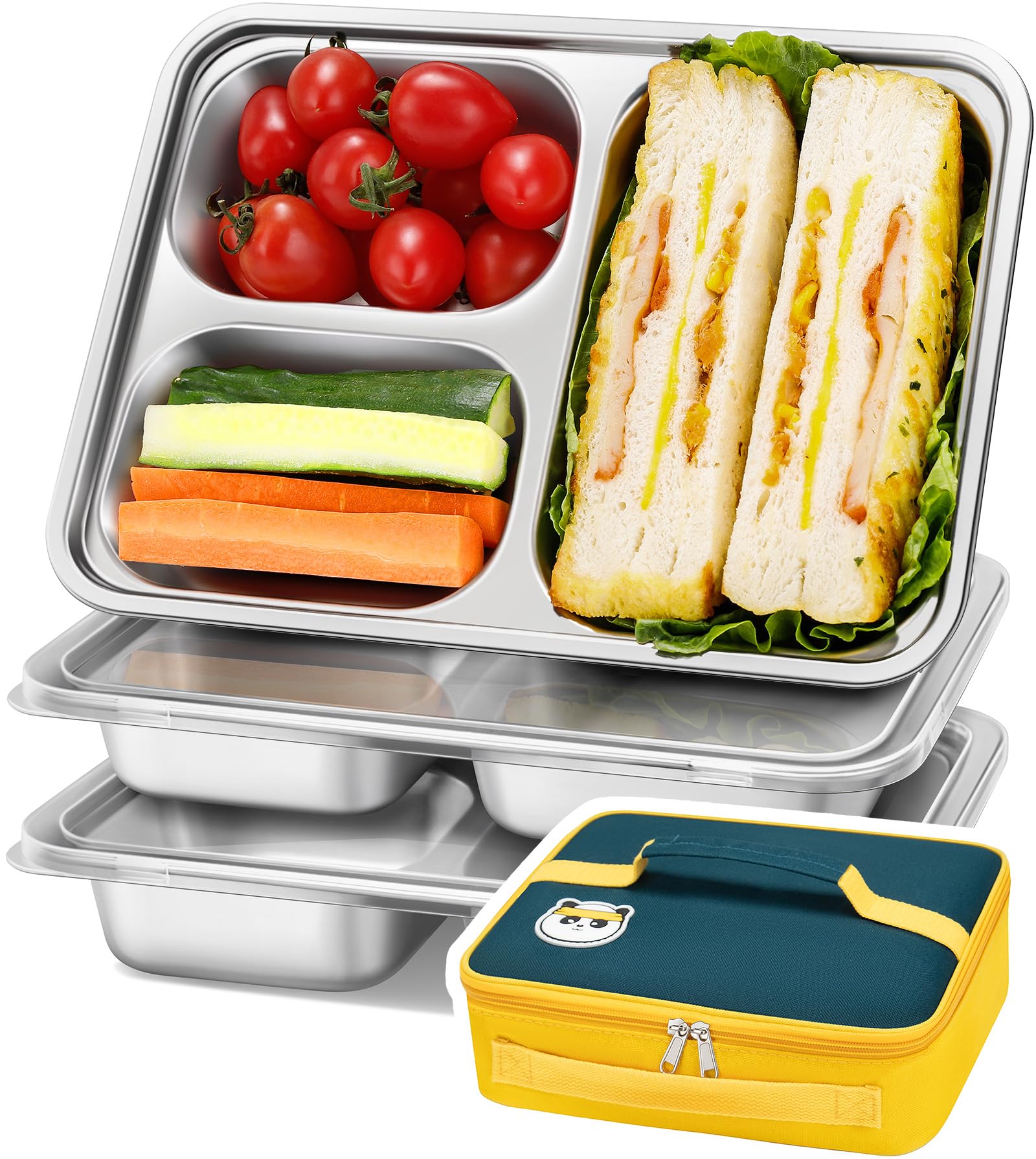 KTKUDY Paquete de 3 recipientes de acero inoxidable para aperitivos y almuerzos con tapas de plástico, recipientes de preparación