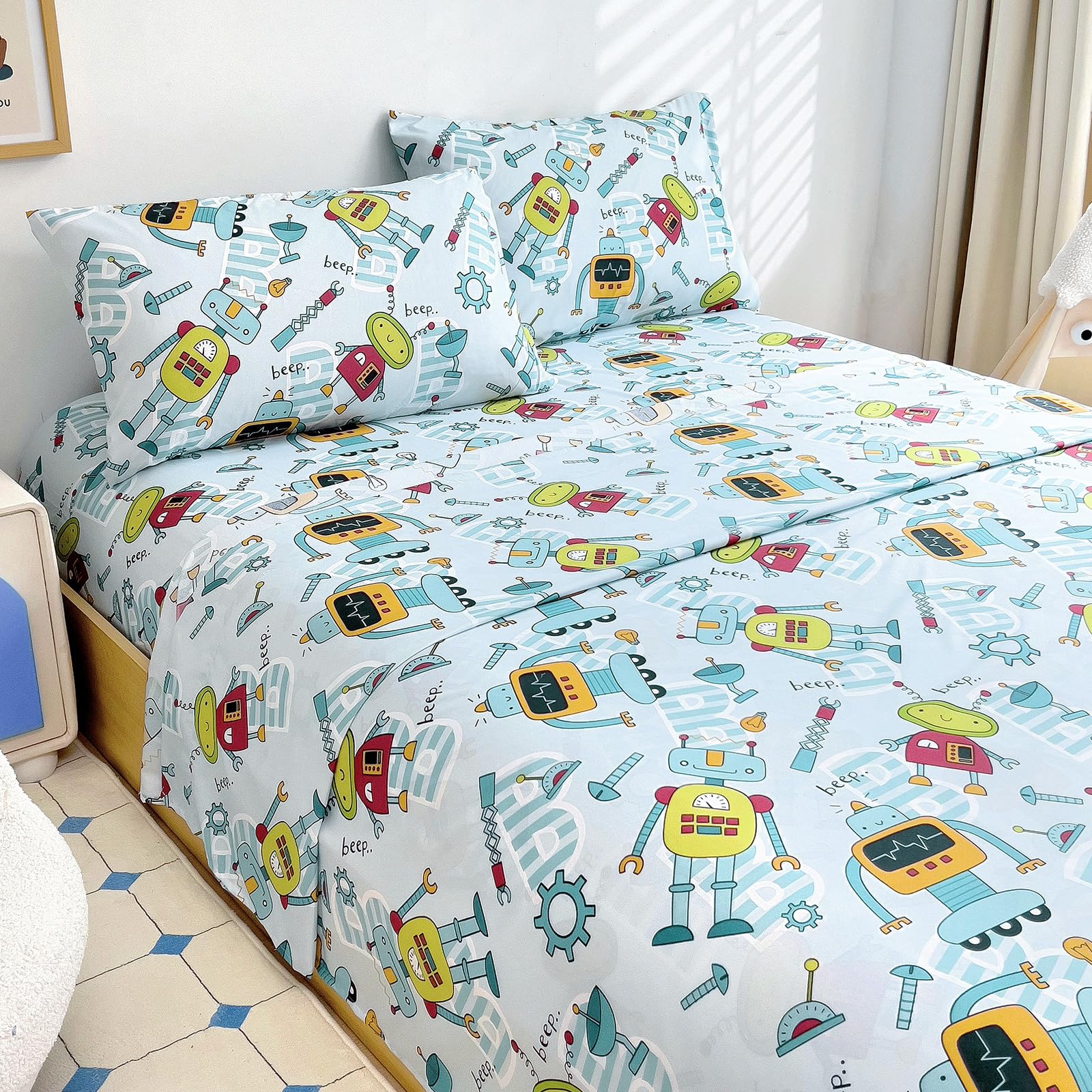 Juego de sábanas tamaño matrimonial para niños, 4 piezas de robot, para niños, niñas, adolescentes, niños pequeños, bolsillos prof