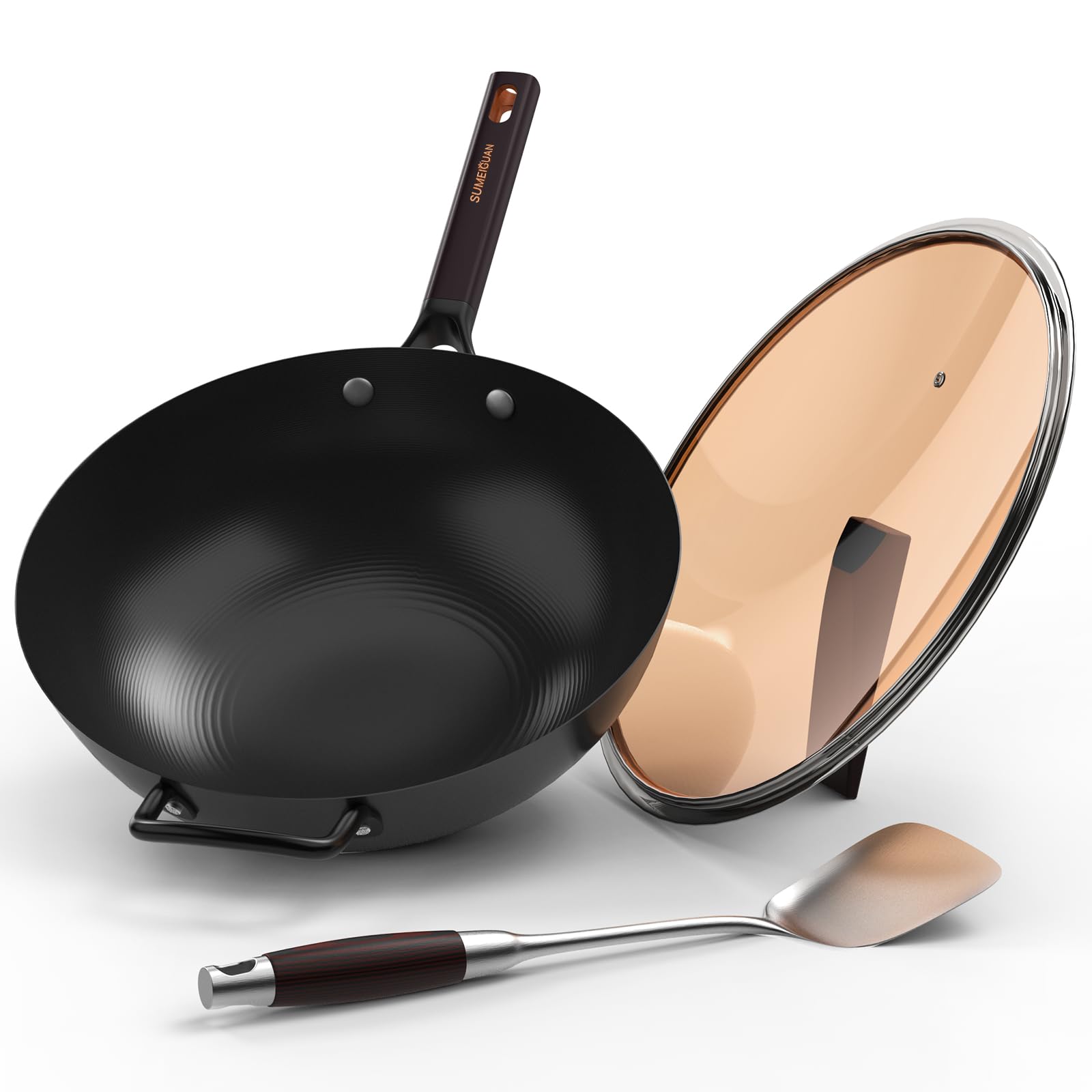 Pan Wok de acero al carbono de 13.5 pulgadas con tapa, sartenes antiadherentes, wok chino, fondo plano, sartenes grandes de hierro