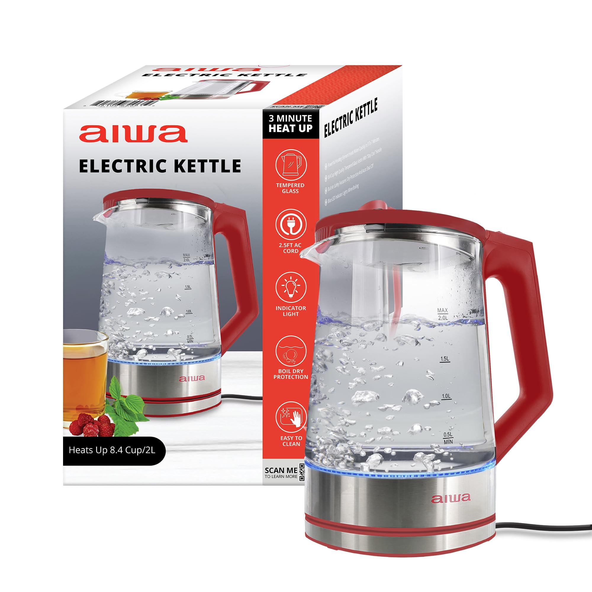 Aiwa Hervidor de agua eléctrico, caldera de agua caliente rápida de 2 litros/8.4 tazas, tetera eléctrica de vidrio de borosilicato