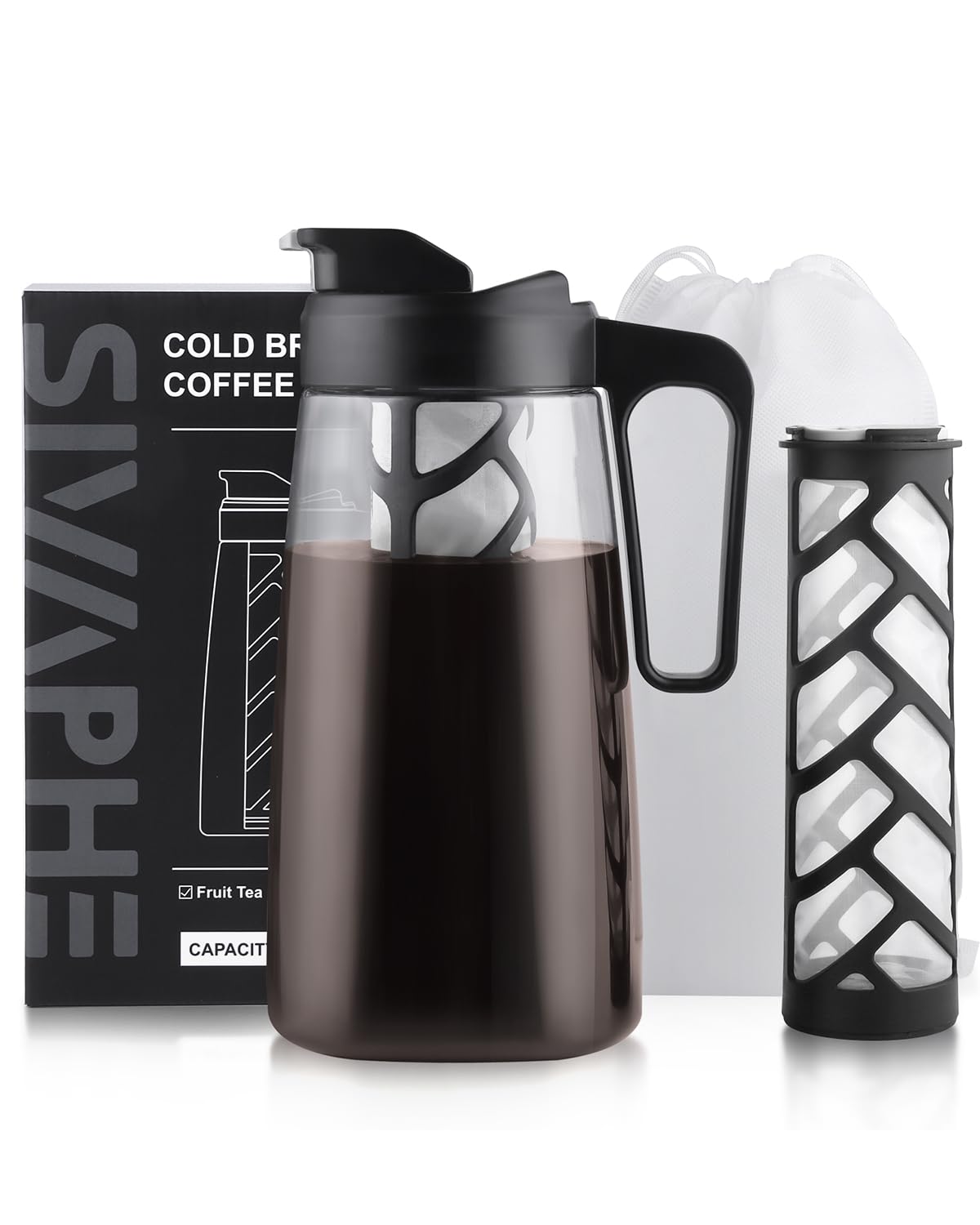 Sivaphe Cafetera grande fría de hielo de 2 cuartos de galón, jarra Traitan, a prueba de fugas, filtro reutilizable de 64 onzas, ca