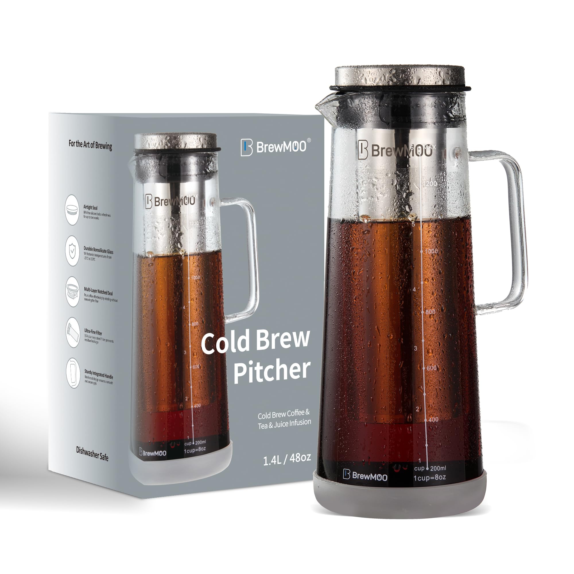 Cafetera fría y máquina de té helado, jarra elegante de vidrio de borosilicato de 1.4L/48 onzas con filtro de acero inoxidable, ta