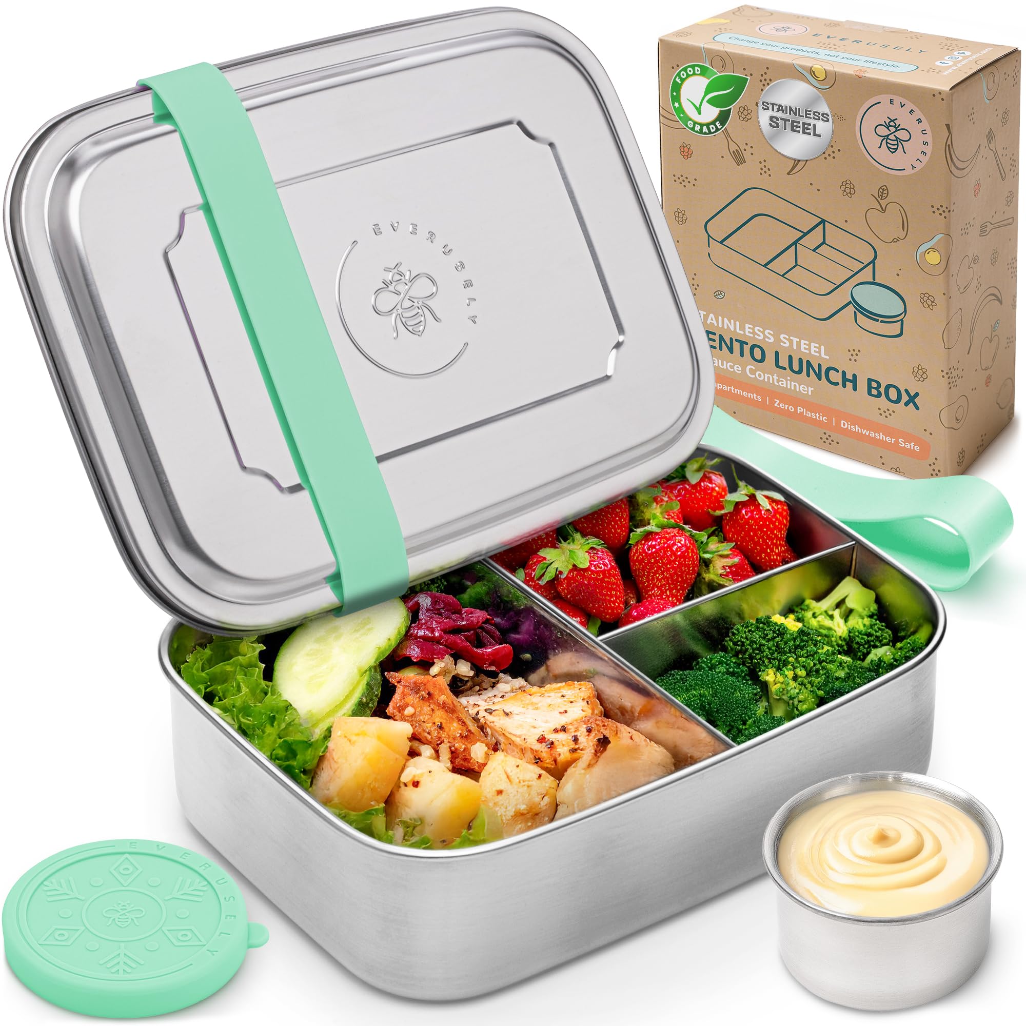 Everusely – Caja Bento para niños – Verde, 60 onzas / 1.8 L – Lonchera de acero inoxidable con contenedor de condimentos a prueba
