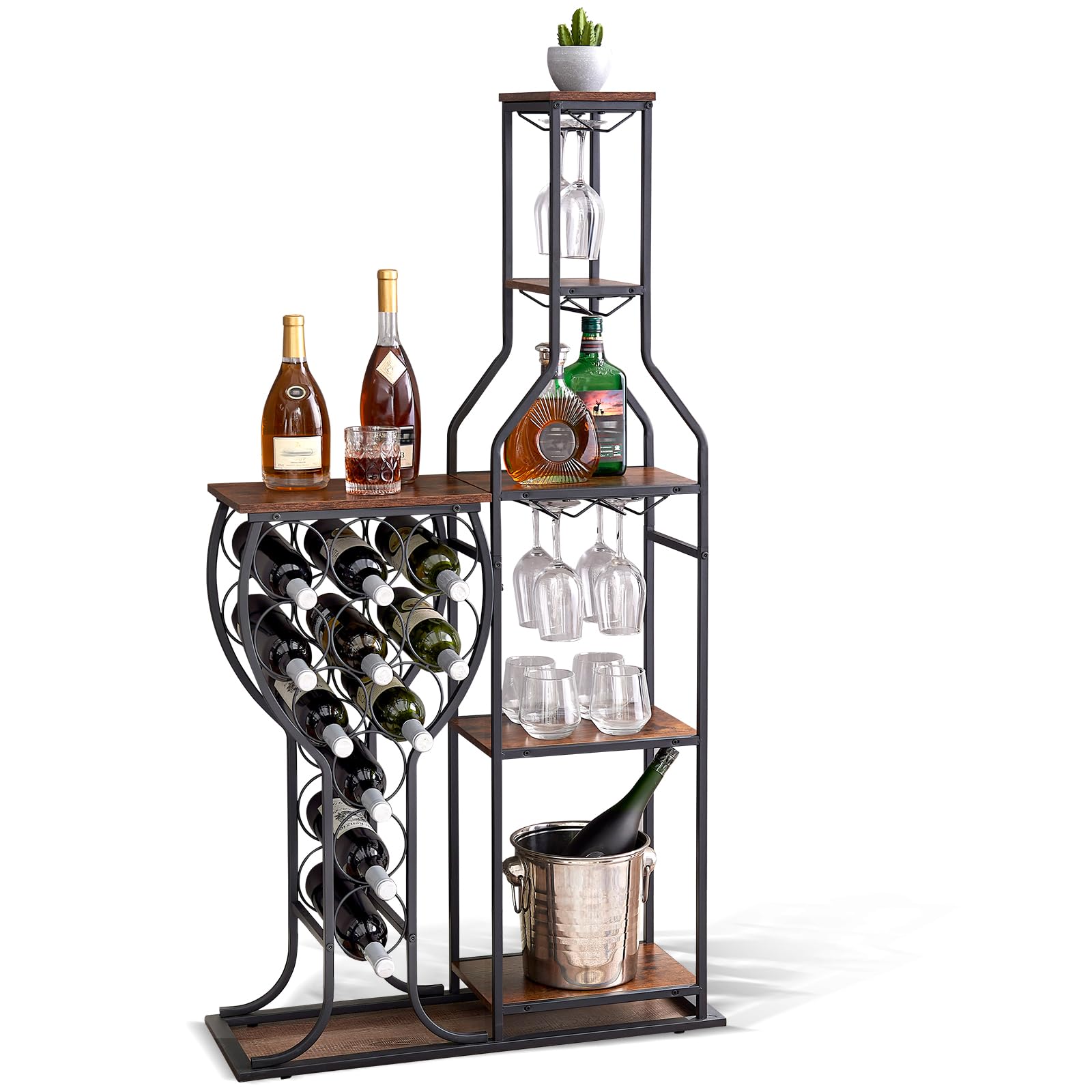 Estante esquinero de 5 niveles independiente para almacenamiento de licores con soporte para copas de vino colgante y vallas, para