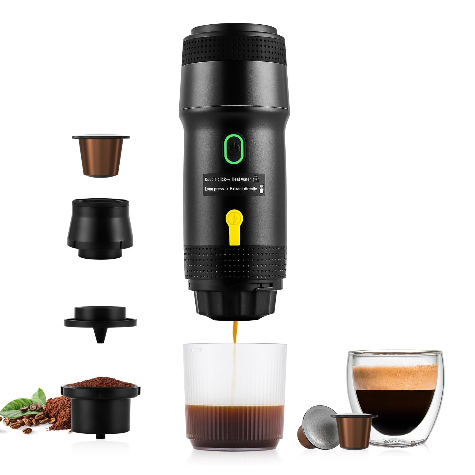 Cafetera de café expreso portátil, mini cafetera de viaje de 20 bares con USB, cafetera de camping 3 en 1 con autocalentamiento, c