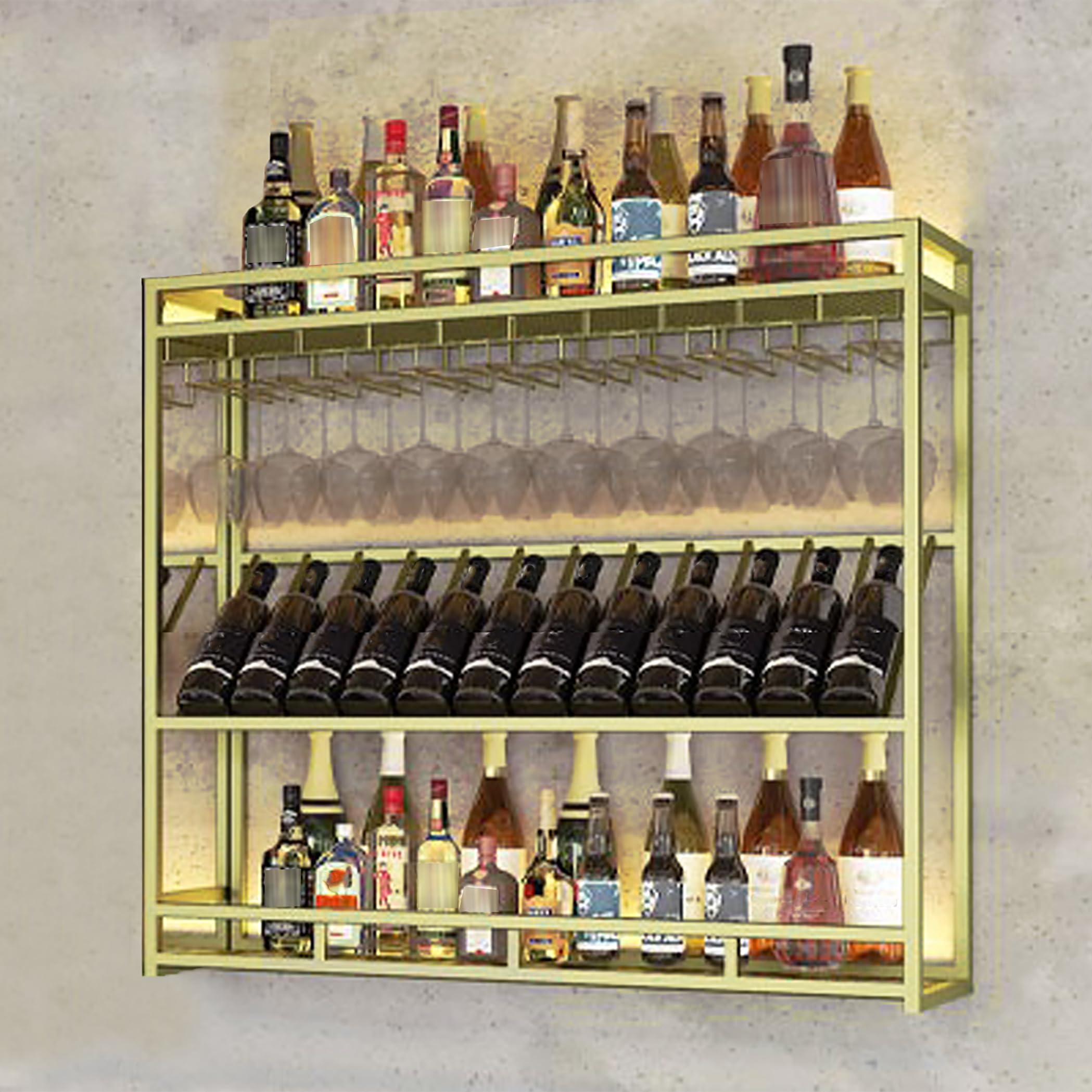 Estante de vino montado en la pared con soporte de vidrio de iluminación LED, estantes para botellas de licor, organizador de alma