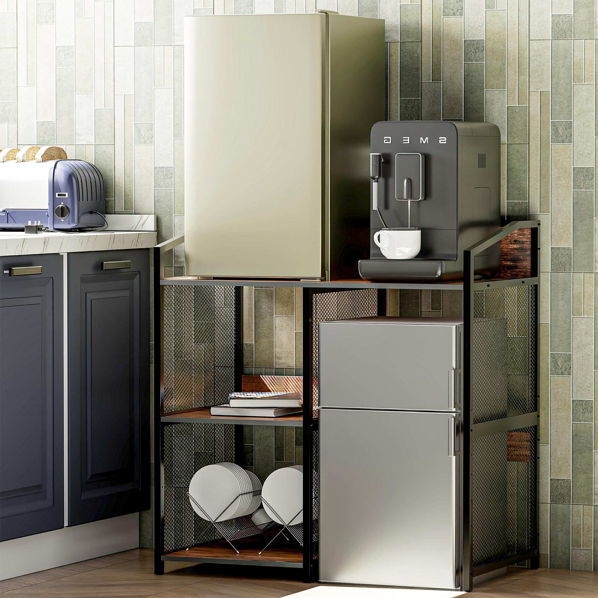Mini soporte para refrigerador con almacenamiento, microondas y mini soporte para refrigerador con toma de corriente, barra de caf
