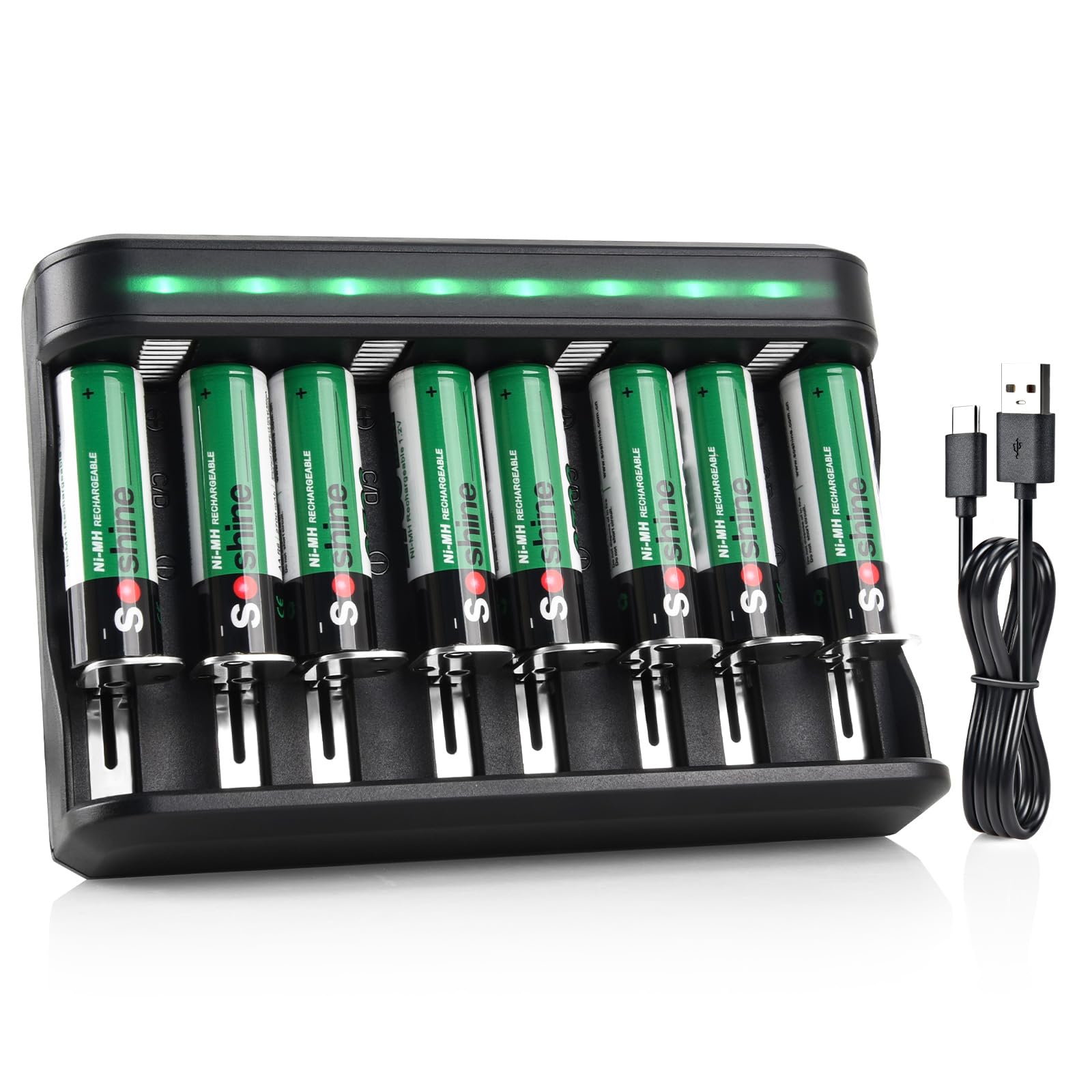 Soshine Baterías AA recargables con cargador, baterías recargables dobles de 2700 mAh, paquete de 8 con cargador rápido de 8 bahía