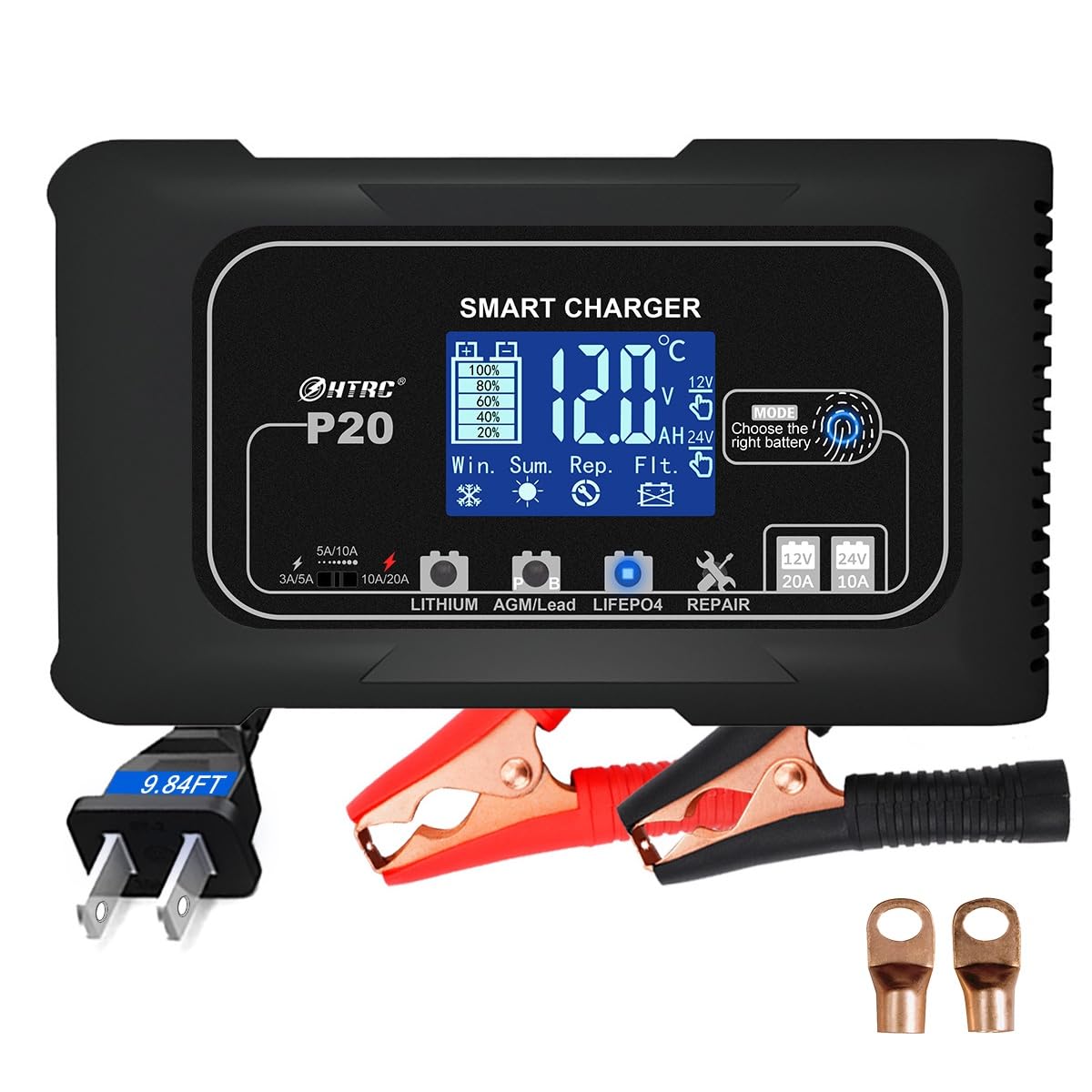 LiFePO4 – Cargador de batería de litio de 20 amperios, 12 V, 24 V, cargador de goteo para batería de automóvil, motocicleta, corta
