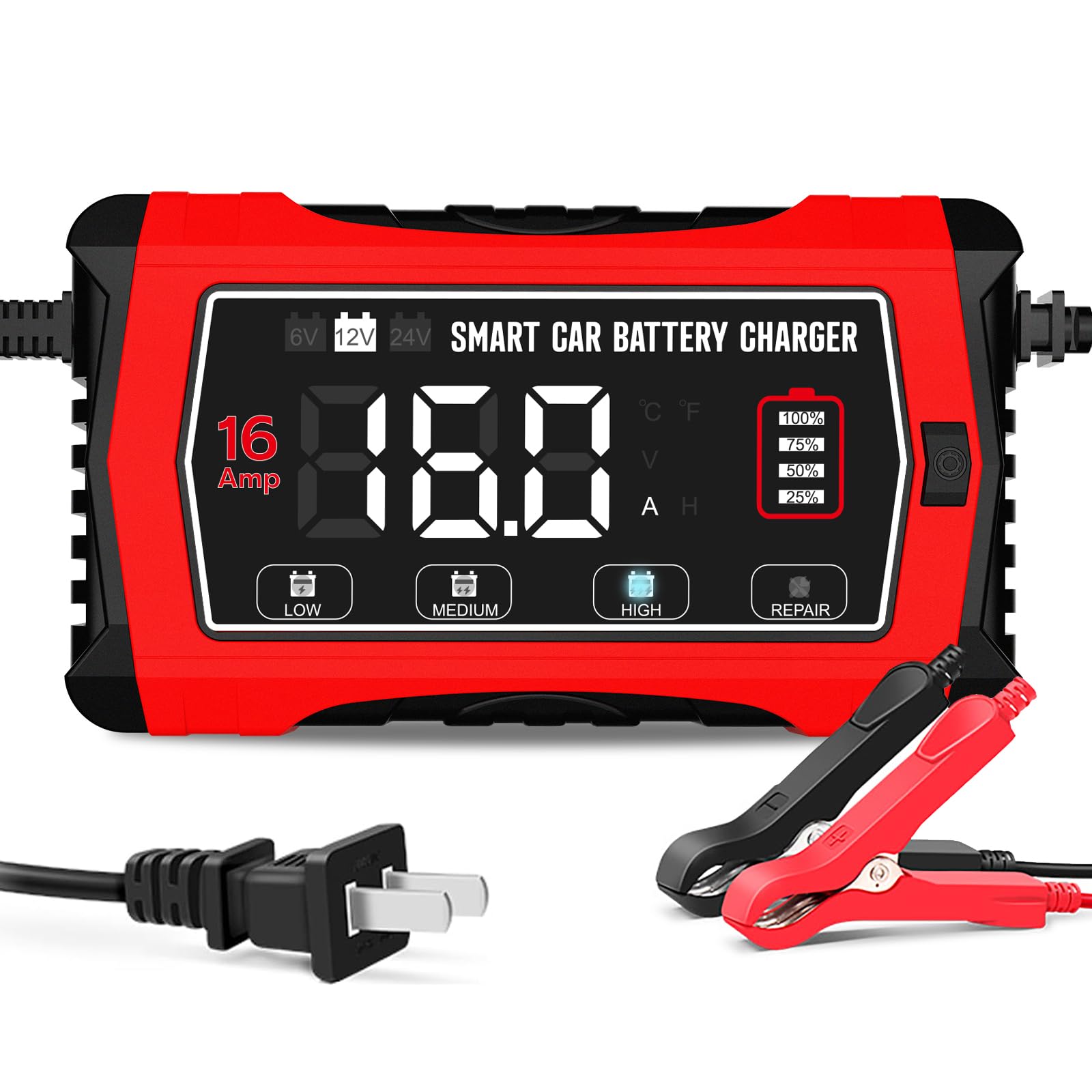 Cargador de batería de 16 amperios, 6 V, 12 V, 24 V, litio, LiFePO4, plomo ácido, cargador de batería inteligente para automóvil,