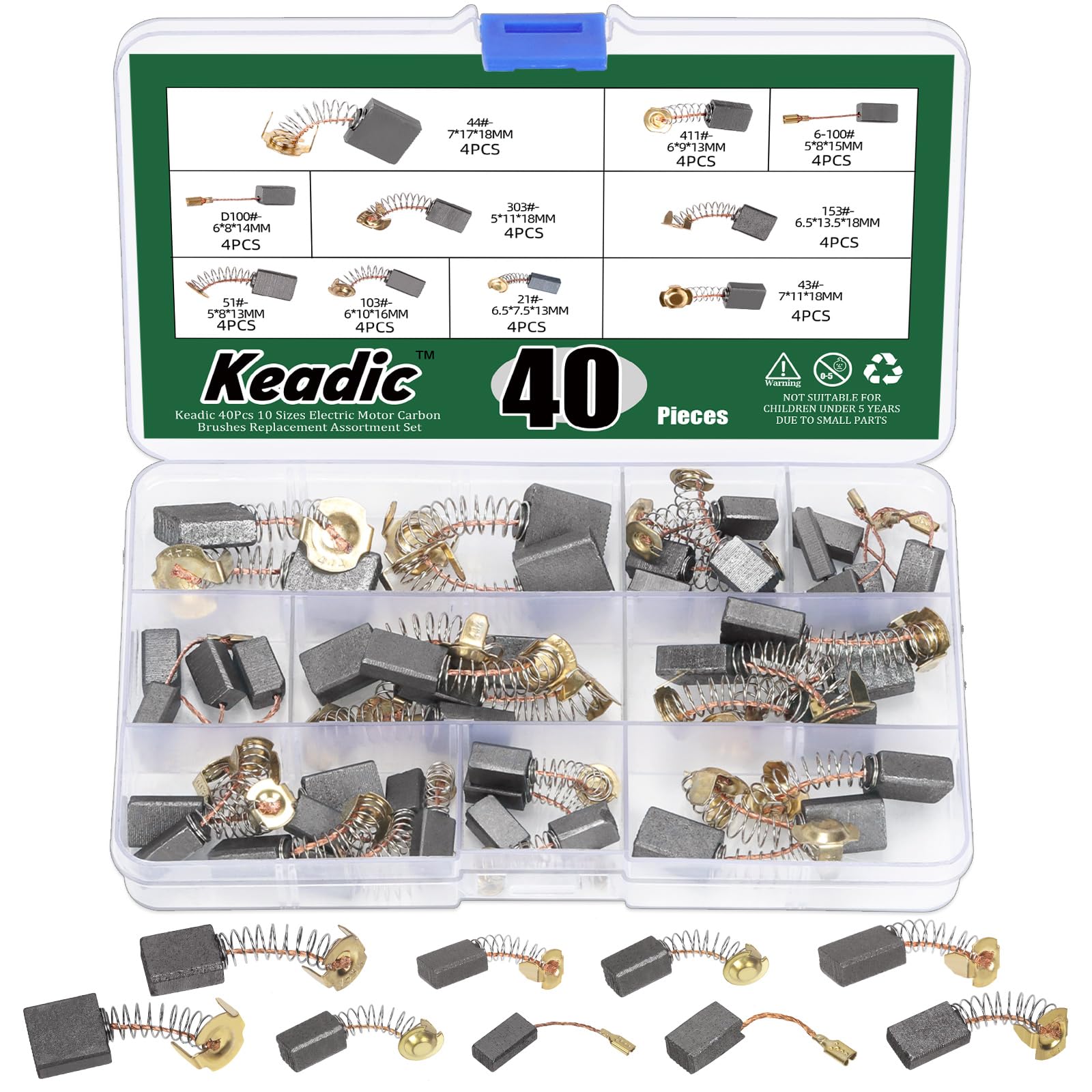 Keadic Juego surtido de 40 piezas de 10 tamaños de cepillos de carbón para motor eléctrico, cepillo de motor de herramienta eléctr