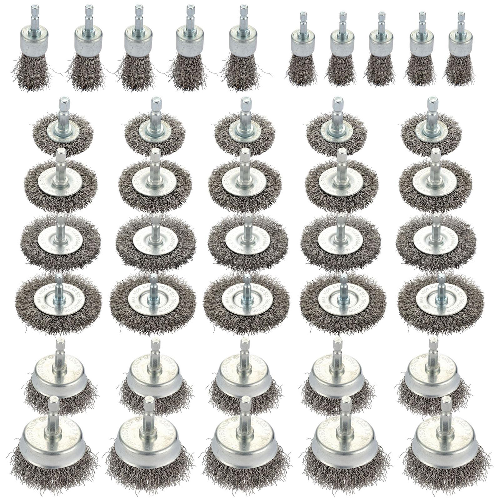 Paquete de 40 cepillos de alambre para taladro, rueda de alambre de acero al carbono para taladro con vástago hexagonal de 1/4 pul