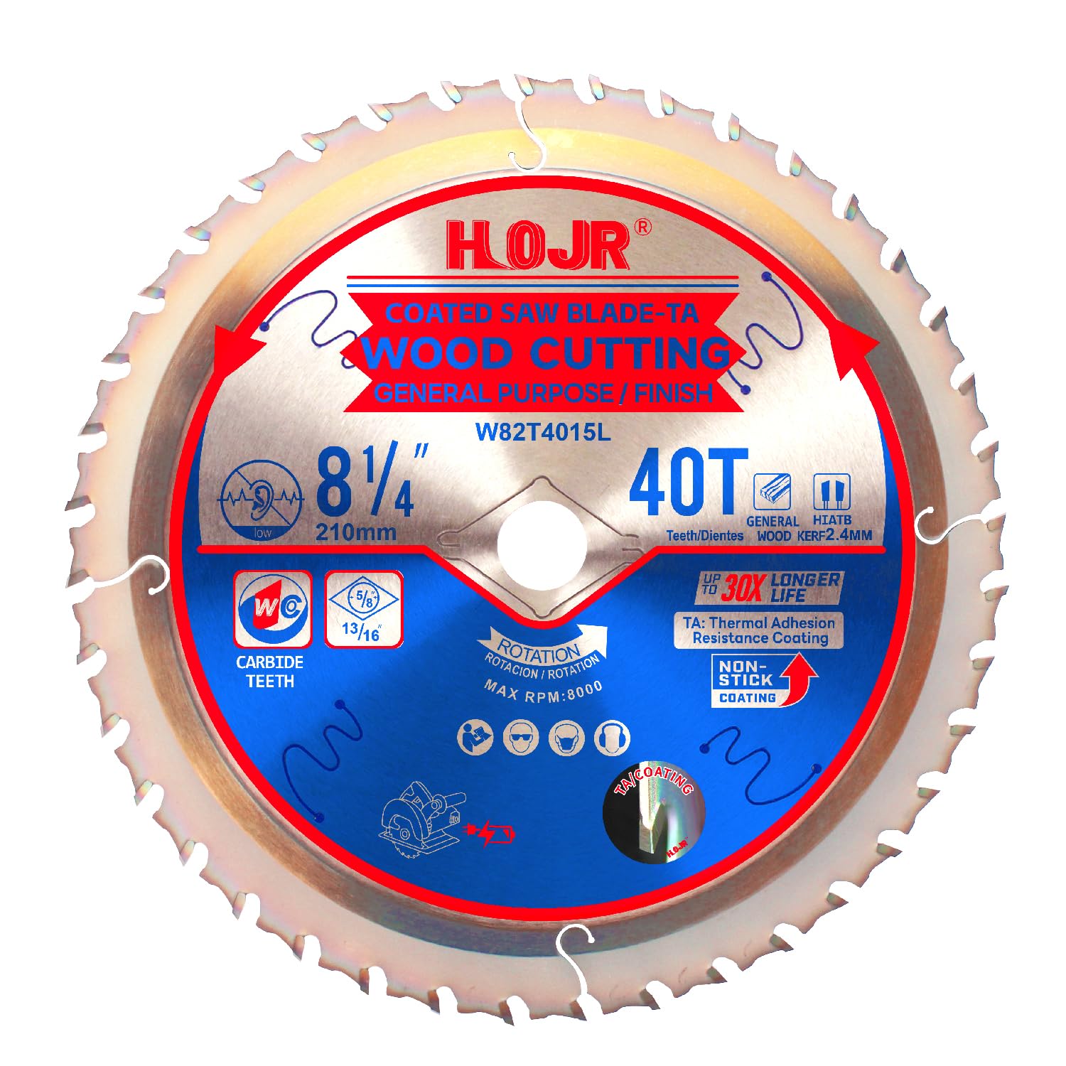6-1/2″ a 12″ TCT, 8-1/4″ Hoja de sierra circular de 40 dientes, Hoja de corte de madera para acabado/uso general, Árbol: 5/8″, Rec