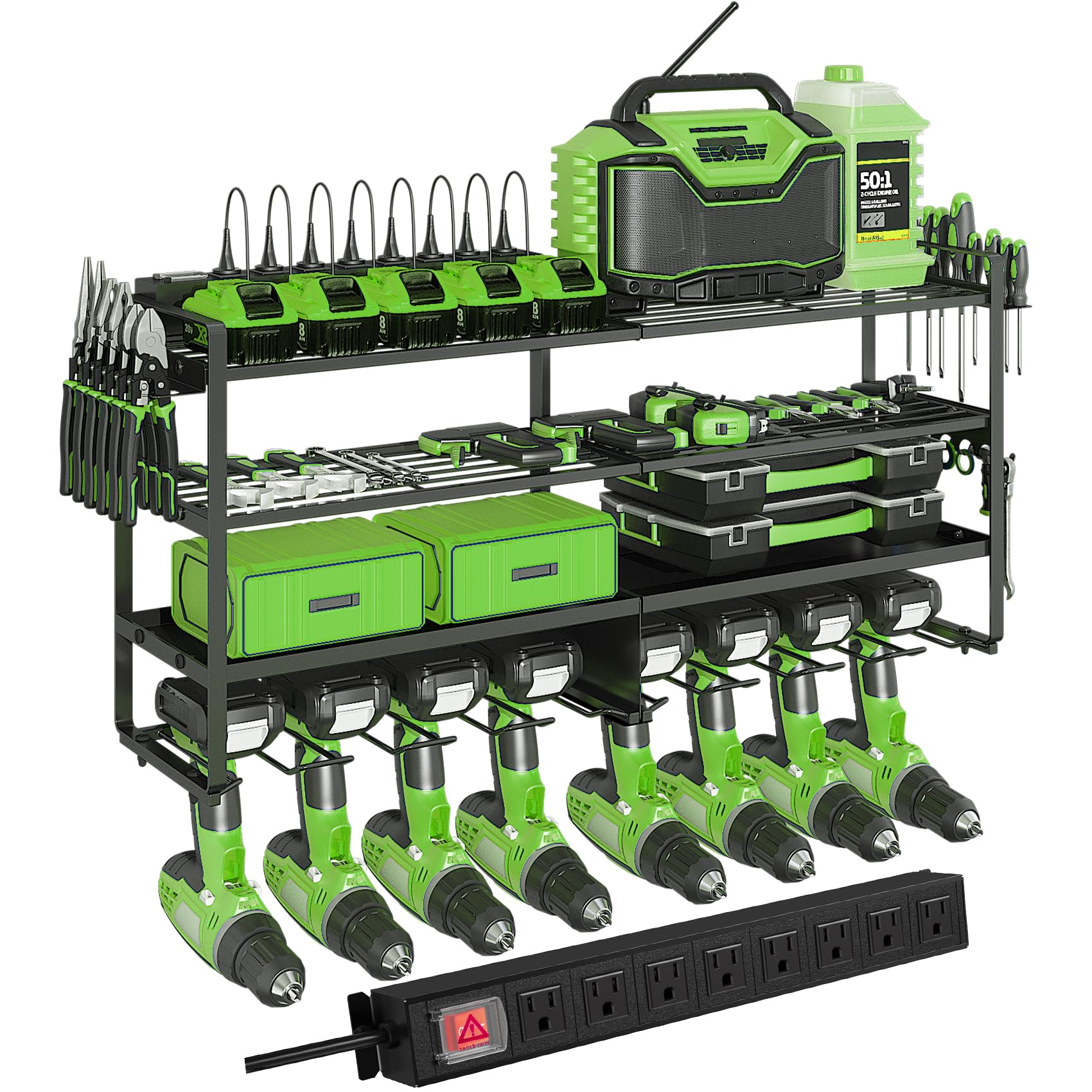 JUNNUJ Organizador de herramientas eléctricas con regleta de alimentación de 10 tomas, soporte de taladro de pared de 4 capas con
