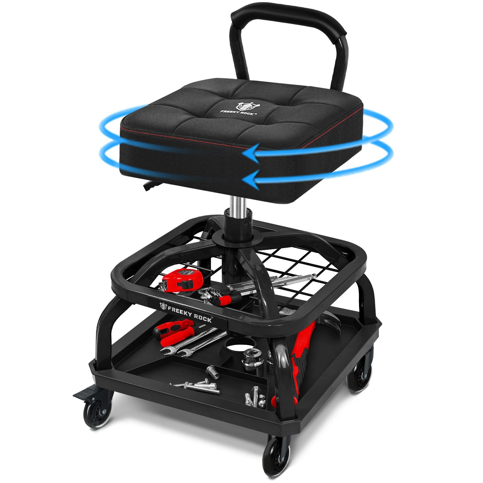 Rolling Shop Taburete con ruedas, silla de taller mecánico de garaje con respaldo de asa, taburete de trabajo de altura ajustable,