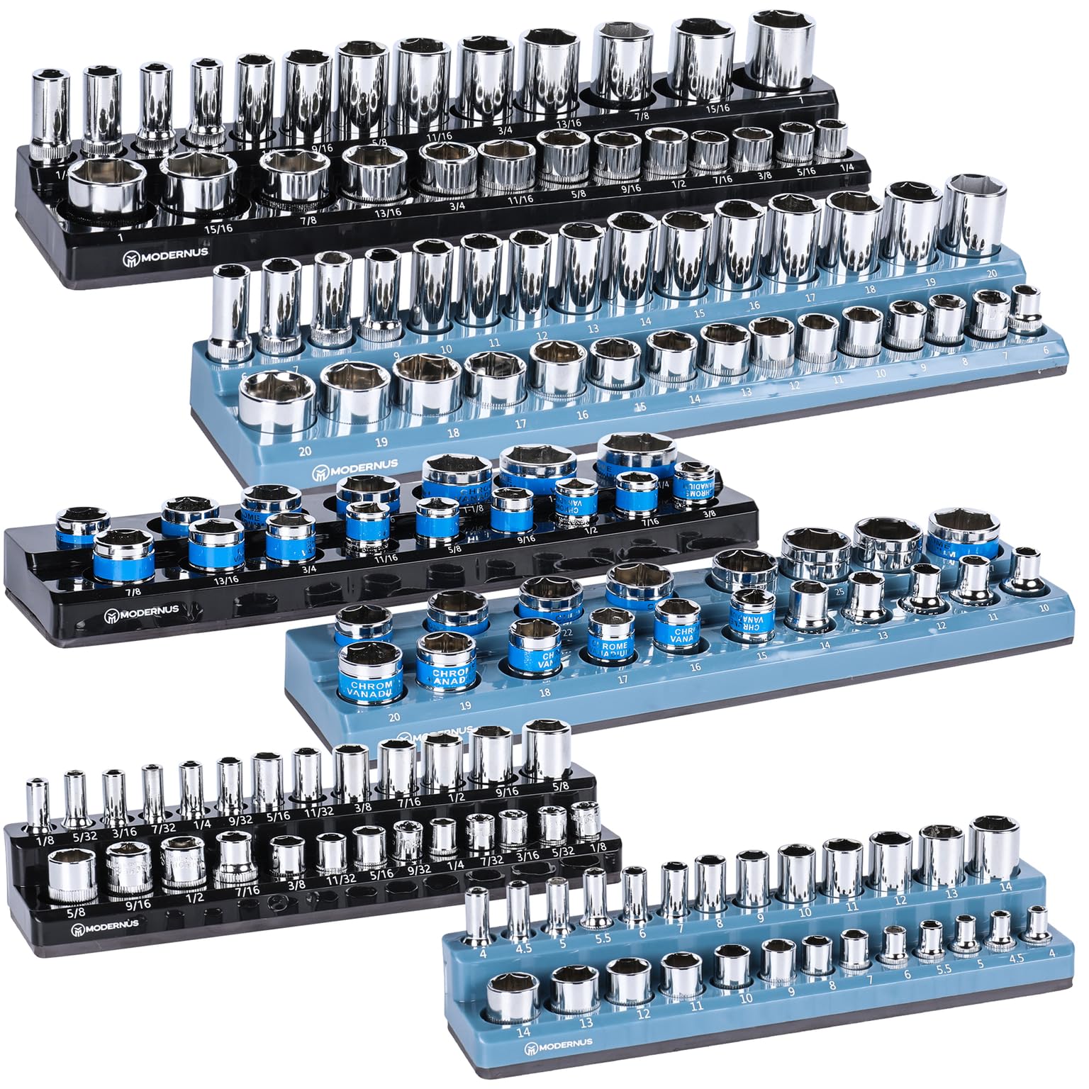 Organizador magnético de llaves – 6 piezas de almacenamiento de herramientas para enchufes SAE y métricos – marcas de tamaño trans