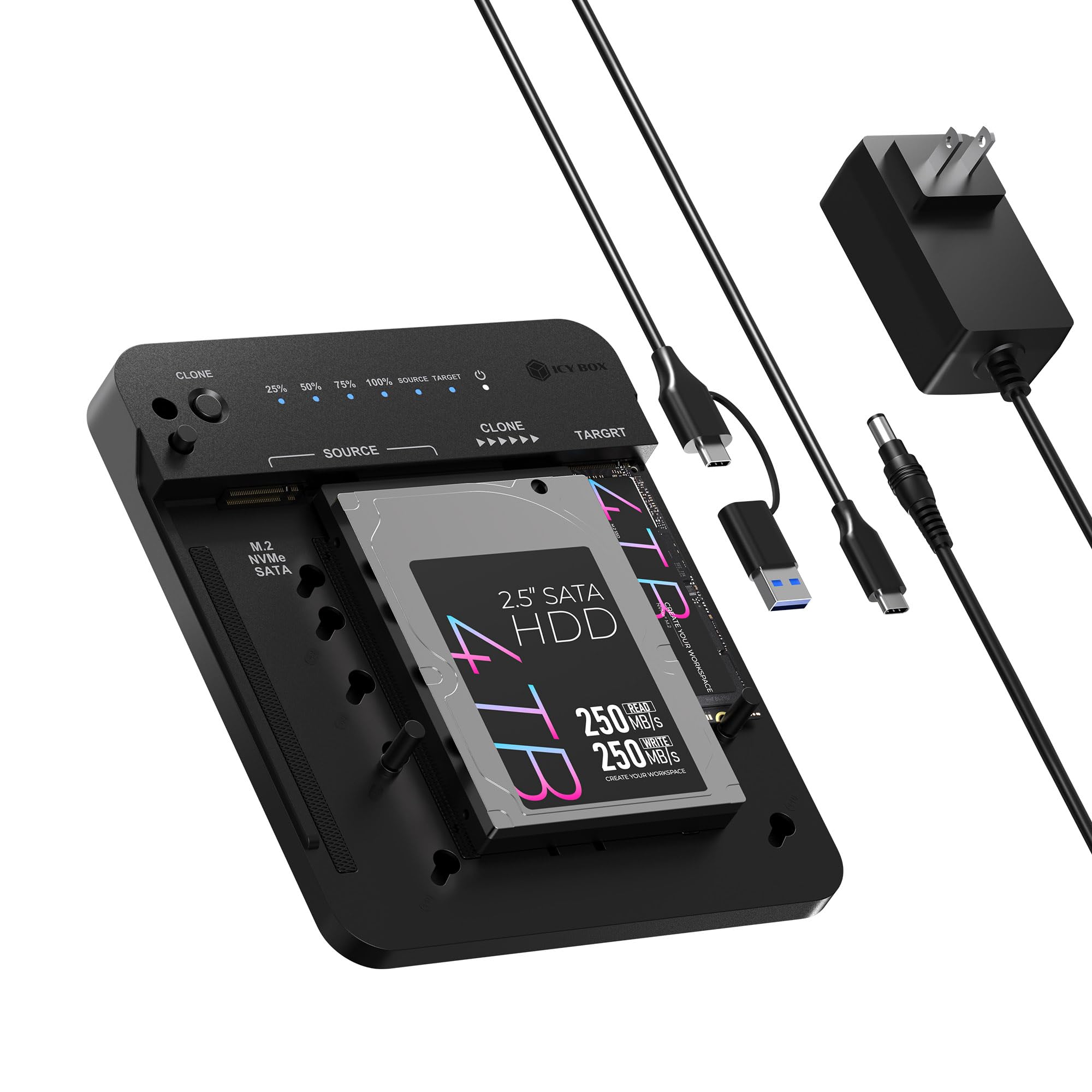 ICY BOX Estación de acoplamiento M.2 NVMe y SATA SSD/HDD, USB-C 3.2 Gen 2 (10 Gbps) Estación de clonación de disco duro y lector d