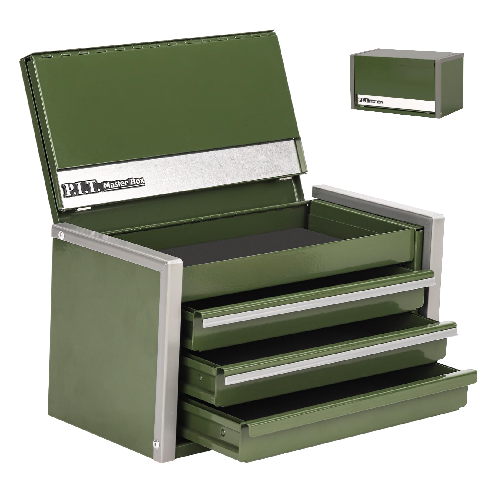 P.I.T. Mini caja de herramientas verde militar, caja de herramientas portátil de acero de 3 cajones con bloqueo magnético, micro p