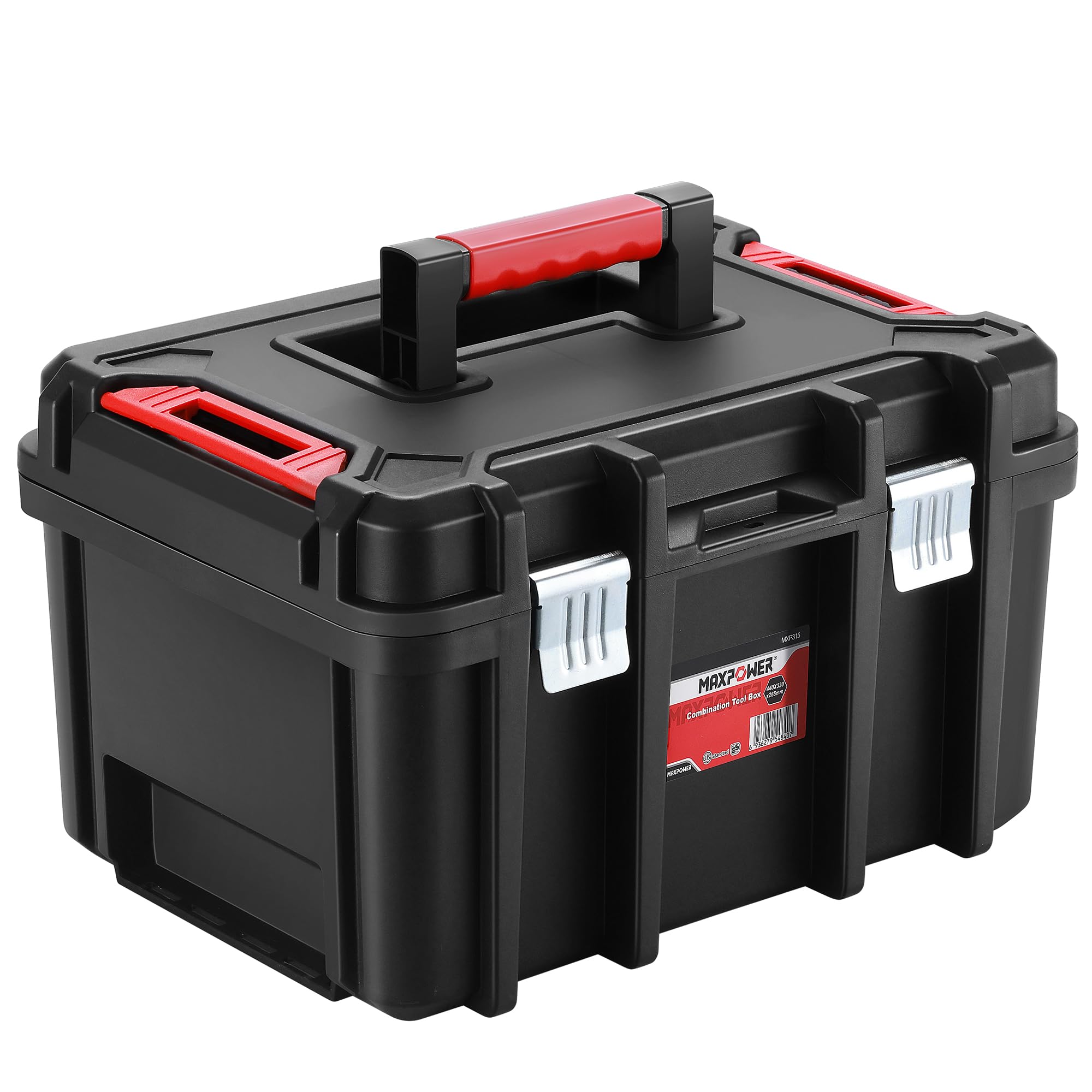 MAXPOWER Caja de herramientas de plástico de 16 pulgadas, caja de herramientas profunda negra con pestillos de metal y bandeja ext