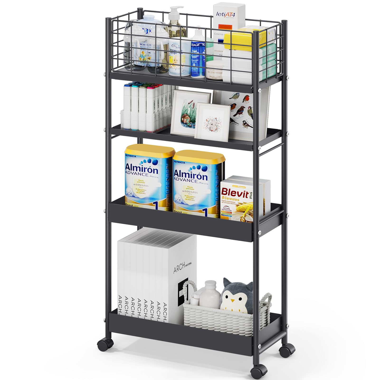KINGRACK Carrito de almacenamiento delgado, carrito de metal de 4 niveles con ruedas, organizador de baño, carrito rodante delgado