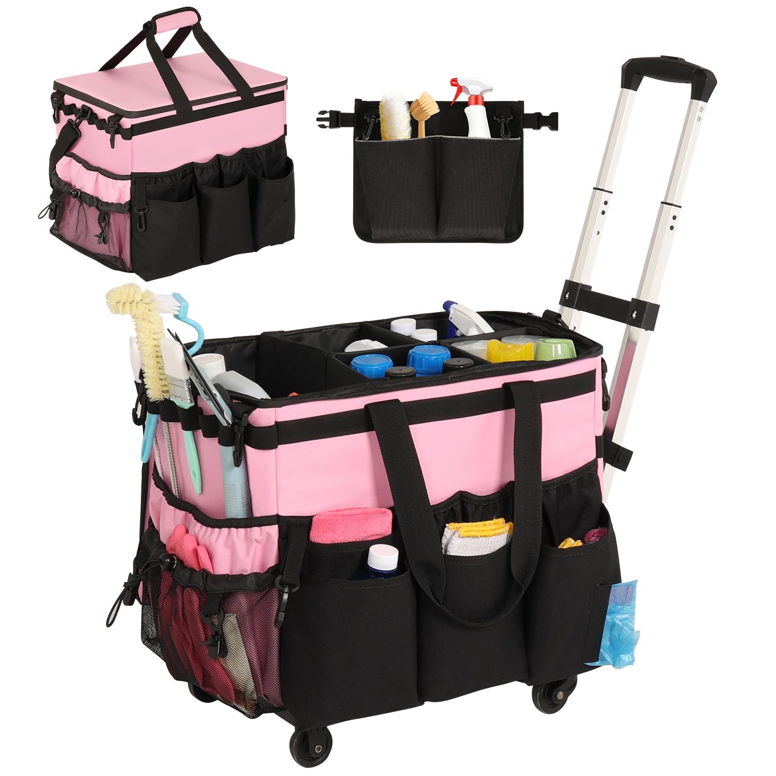 Organizador de limpieza con ruedas, bolsa de limpieza con cinturón para herramientas, organizador grande de suministros de limpiez