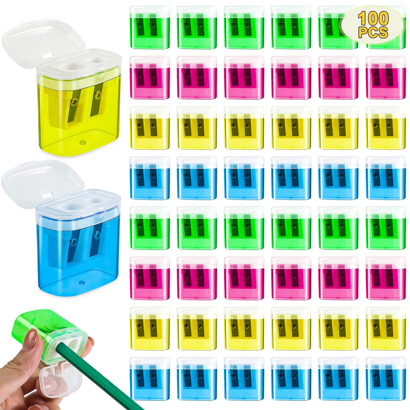 100 sacapuntas a granel, sacapuntas manuales de doble agujero para niños, 4 sacapuntas de mano coloridos con tapa, portátil compac