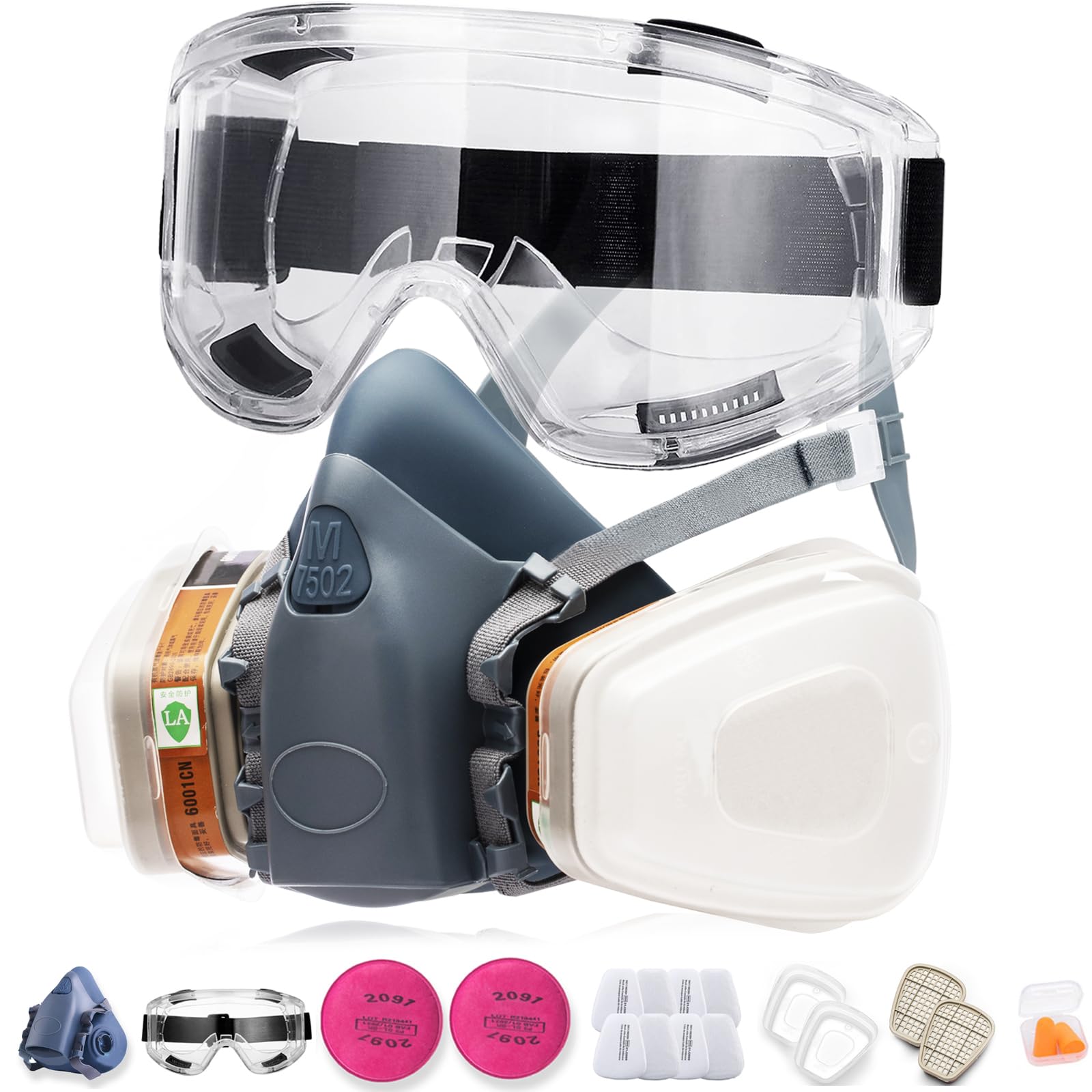 RANKSING 7502 Máscara de gas respirador reutilizable con filtros P100 y gafas contra gases de polvo, humos, productos químicos de