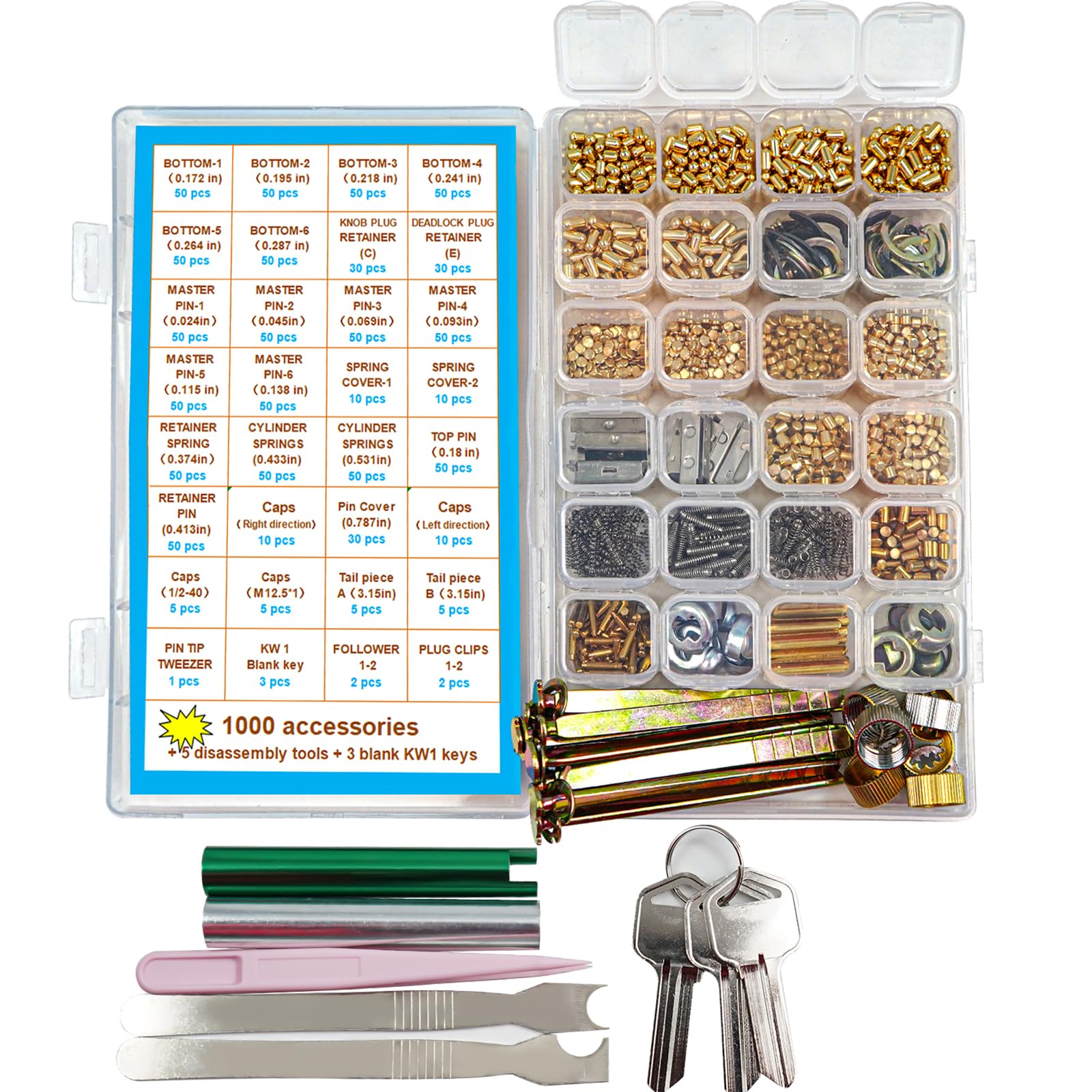 kw1 Compatible con kit de rellave Kw-ikset de 1000 piezas, con pasador inferior 1#-6#, pasador maestro 1#-6#, pin superior, cubier