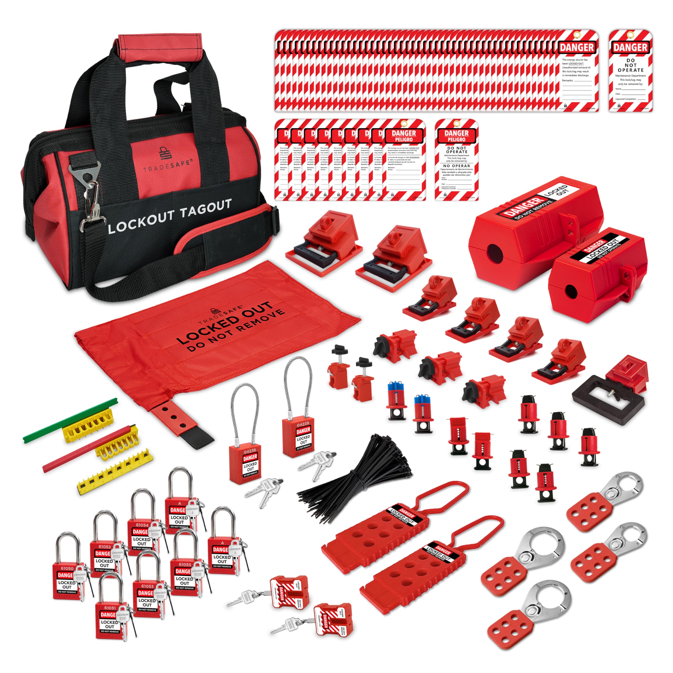 TRADESAFE Kit completo de etiquetado de bloqueo eléctrico: cerrojos, abrazadera, bloqueo universal multipolo y interruptor de circ