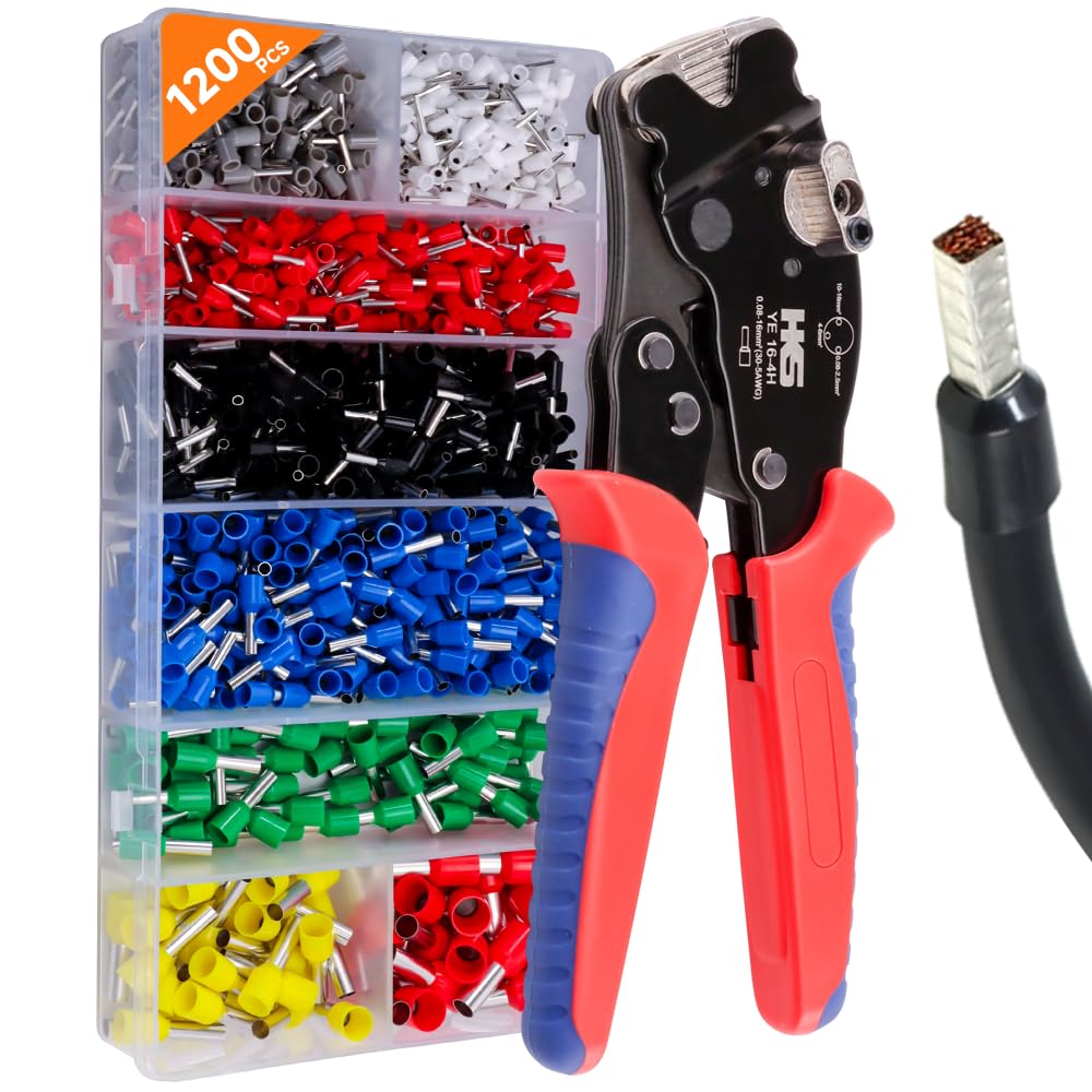 HKS Kit de herramientas de crimpado de virola AWG 30-5 – Rango fijable con 1200 terminales de cobre rojo, crimpadora de trinquete