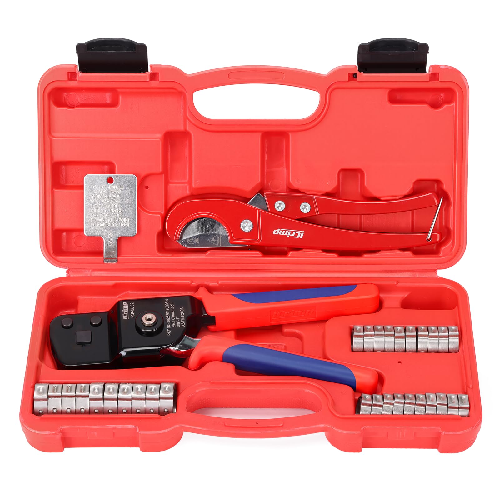 iCrimp – Kit de herramientas de cincha PEX de una mano con 20 abrazaderas PEX de 1/2 pulgada, 10 abrazaderas PEX de 3/4 pulgadas y