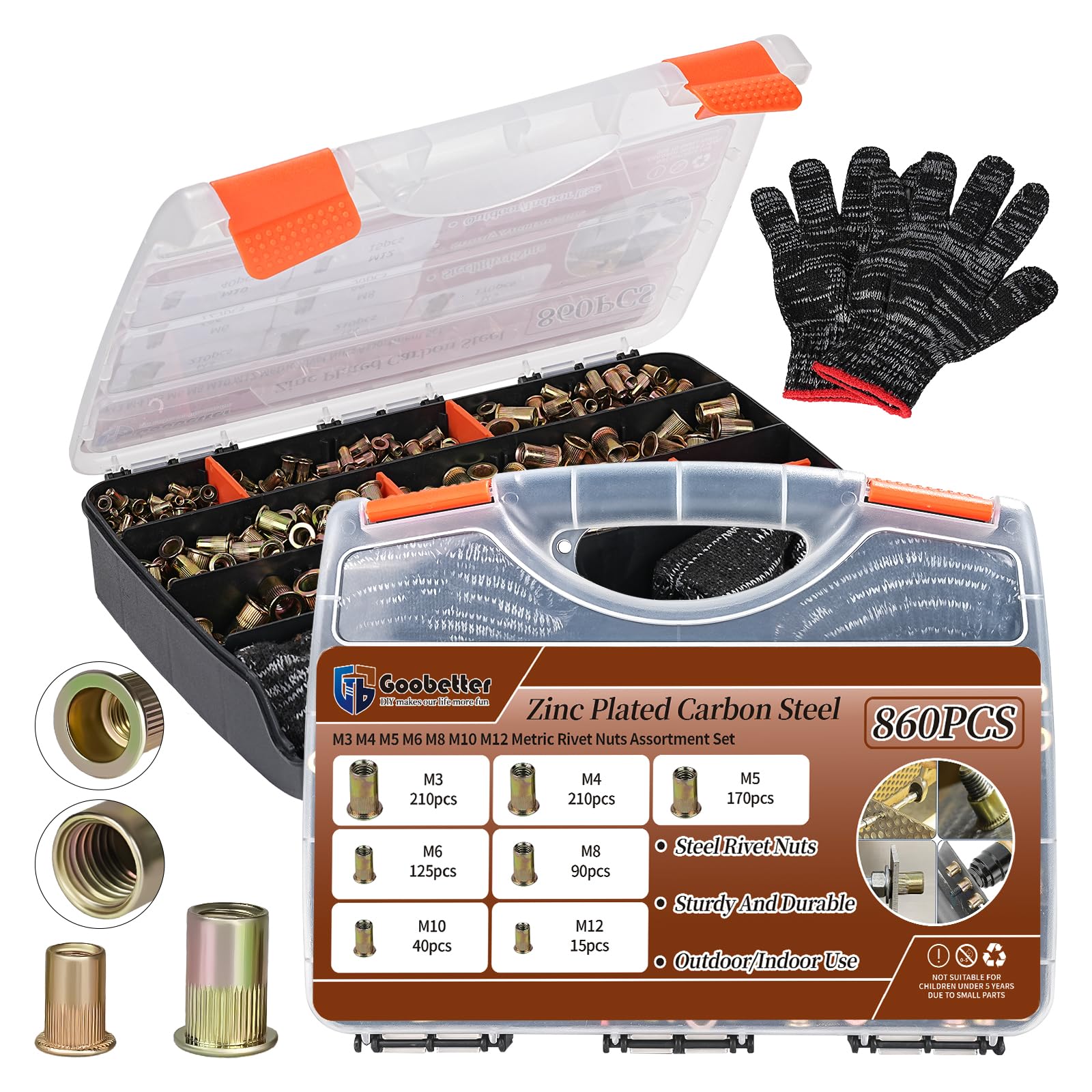 Kit de herramientas de tuerca de remache, 860 piezas de tuercas de remache métrico, M12 M10 M8 M6 M5 M4 M3 tuercas roscadas de cab
