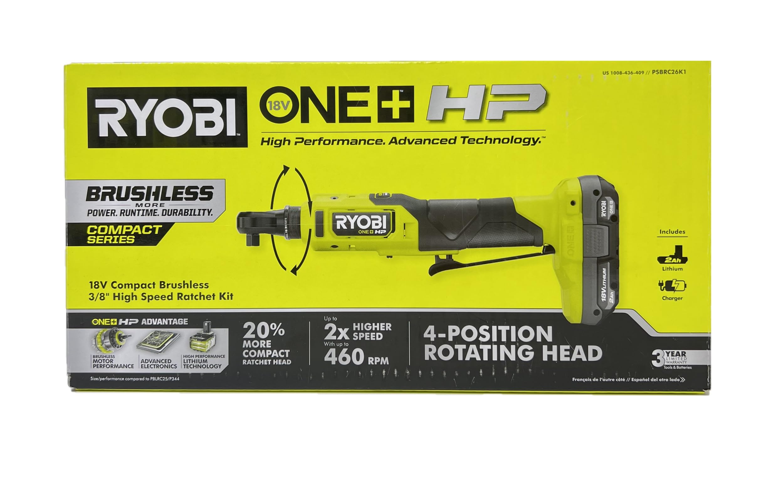 Ryobi – Kit de trinquete de alta velocidad inalámbrico de 3/8 pulgadas ONE+ 18V HP sin escobillas con batería de 2.0 Ah y cargador
