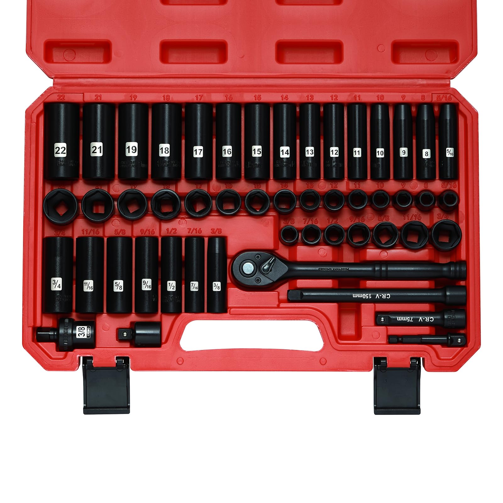 Mayouko Juego de llaves de impacto de 3/8″, 50 piezas SAE estándar (5/16″-3/4″) y tamaño métrico, profundo y poco profundo, 6 punt