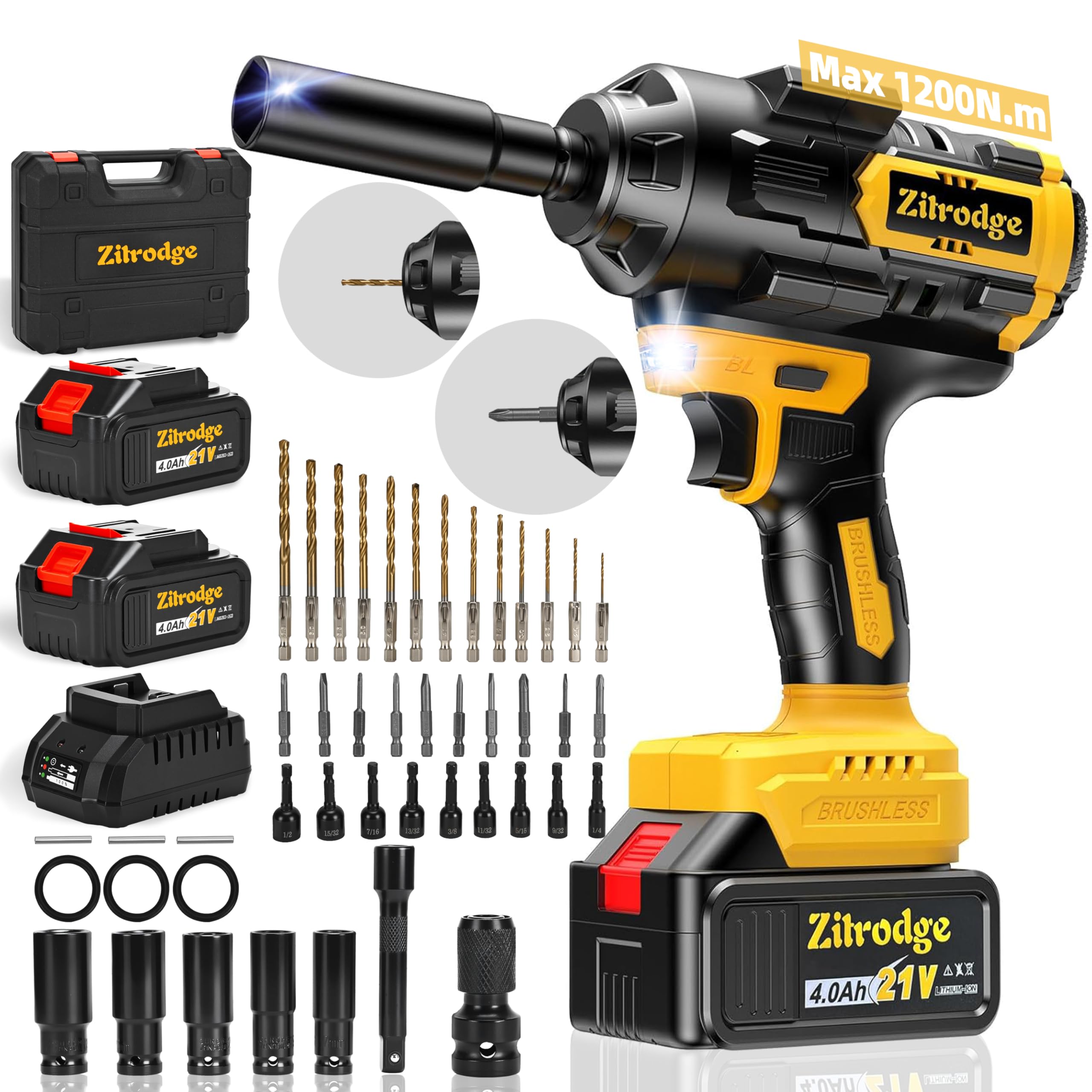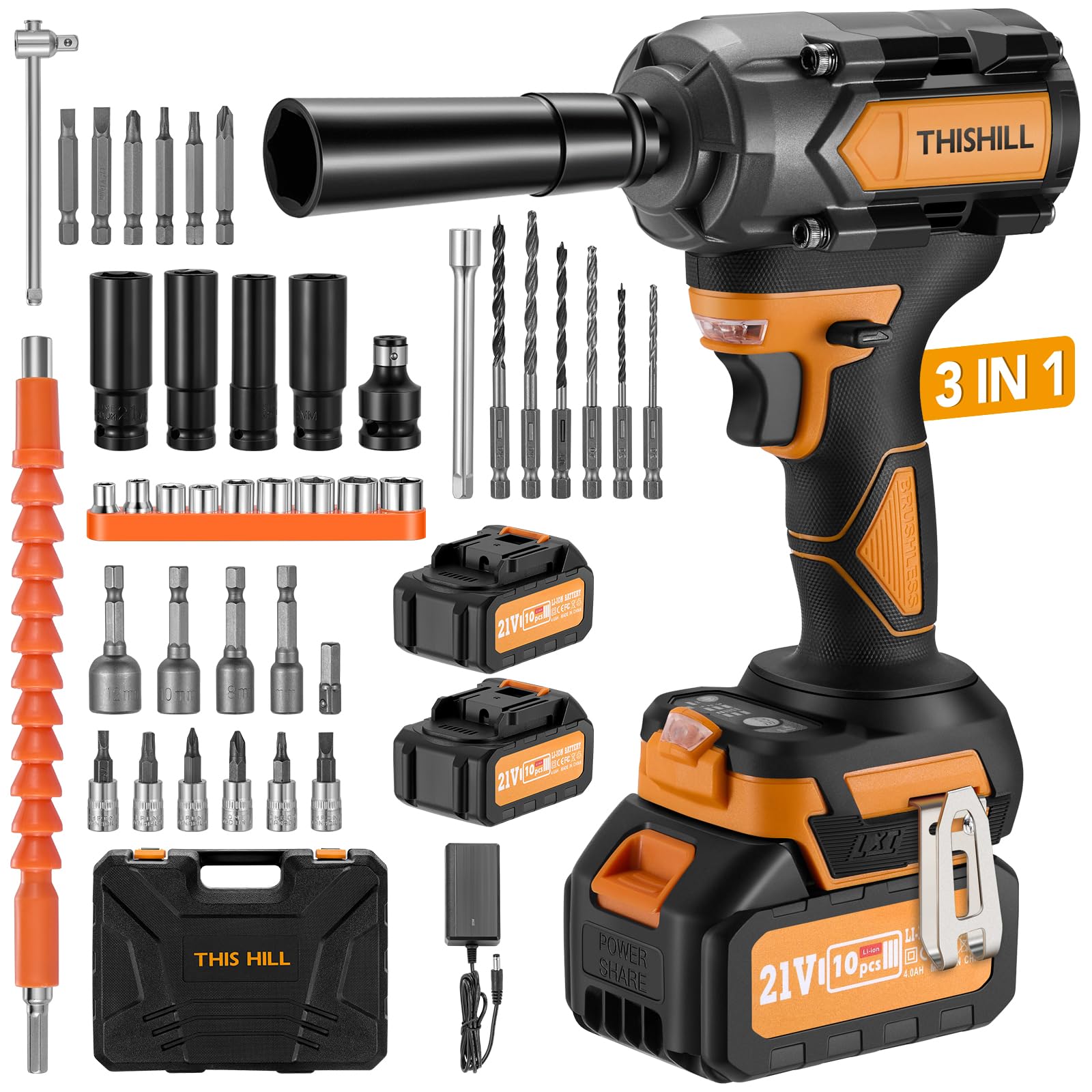 This Hill 45 llaves de impacto inalámbricas, 600 Nm (443 pies-libras), juego de destornilladores lmpact sin escobillas de 1/2 pulg