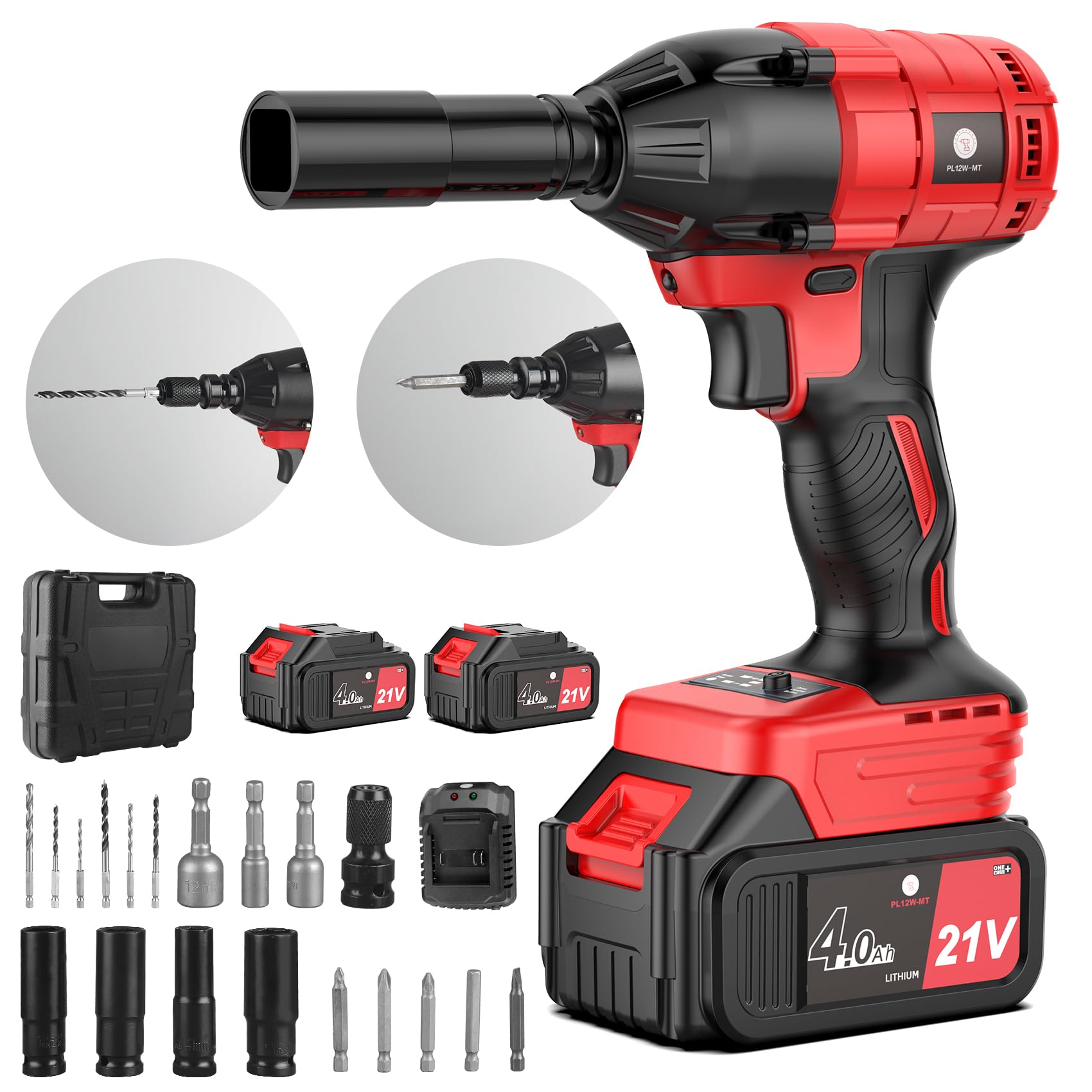 AOBEN Llave de impacto inalámbrica de 1/2 pulgada, pistola de impacto sin escobillas de 21 V 300 N.m con 2 baterías de 4.0 Ah, car