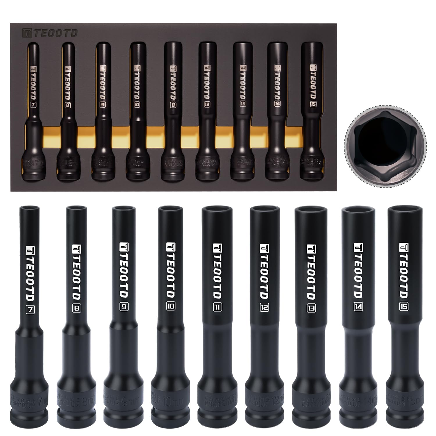 Juego de llaves de impacto de 9 piezas, 1/2 pulgada, juego de llaves métricas profundas integradas de 5.1 pulgadas, enchufe de tue
