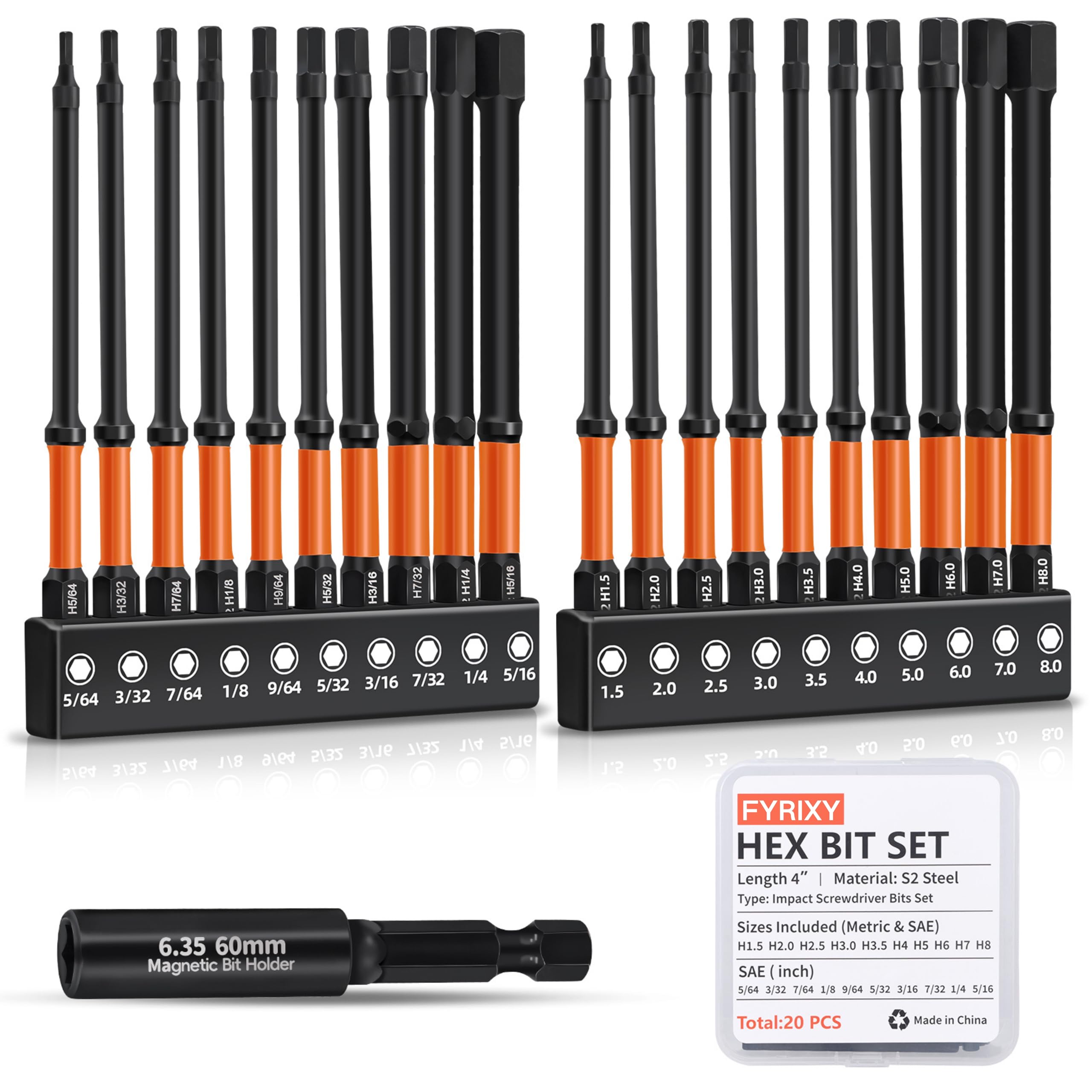 Juego de 20 brocas hexagonales de 4 pulgadas de largo, brocas métricas y SAE Allen con vástago hexagonal de 1/4 pulgadas, acero S2