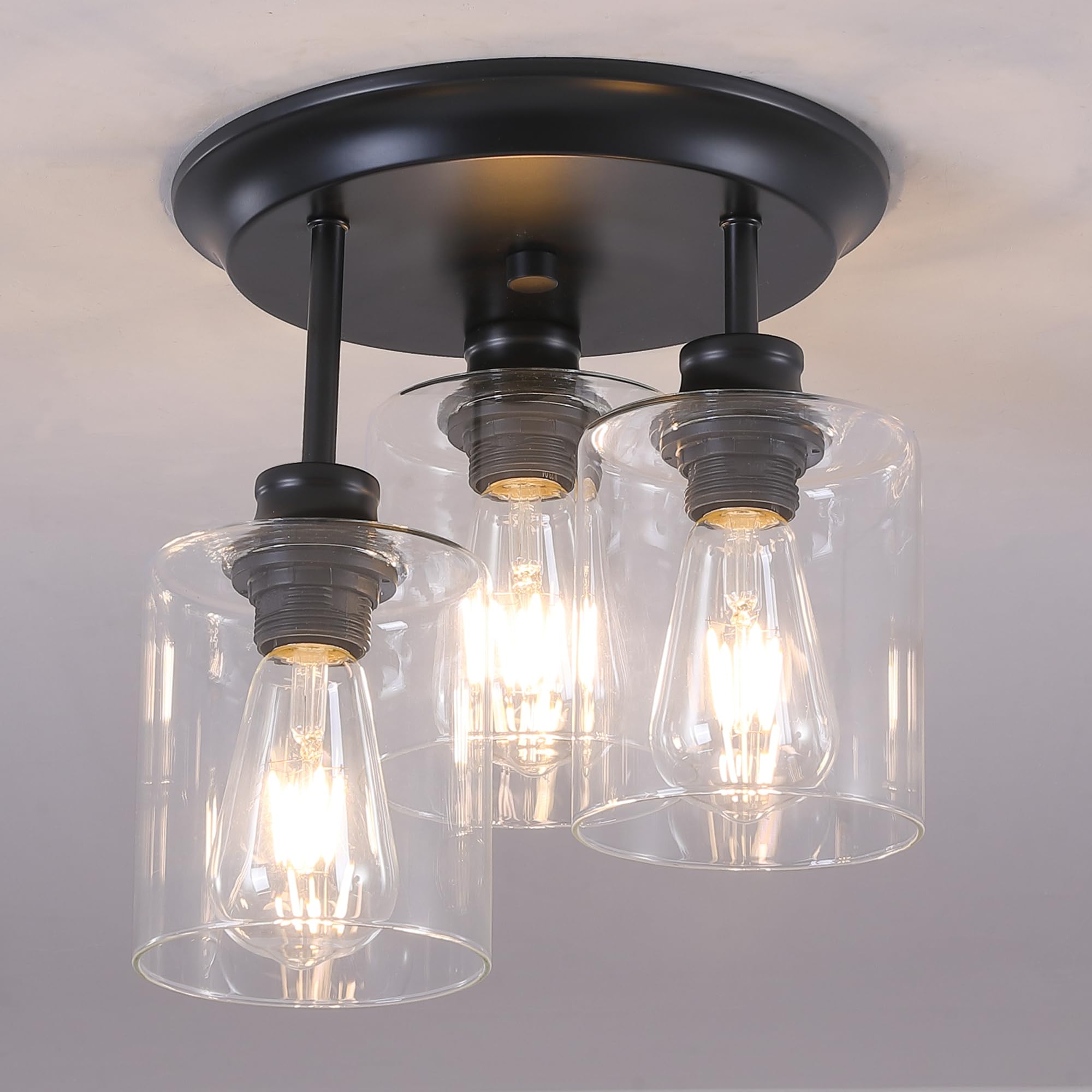 Lámpara de techo semiempotrada, lámpara de cocina negra mate con pantallas de vidrio transparente, 3 lámparas cerca del techo para