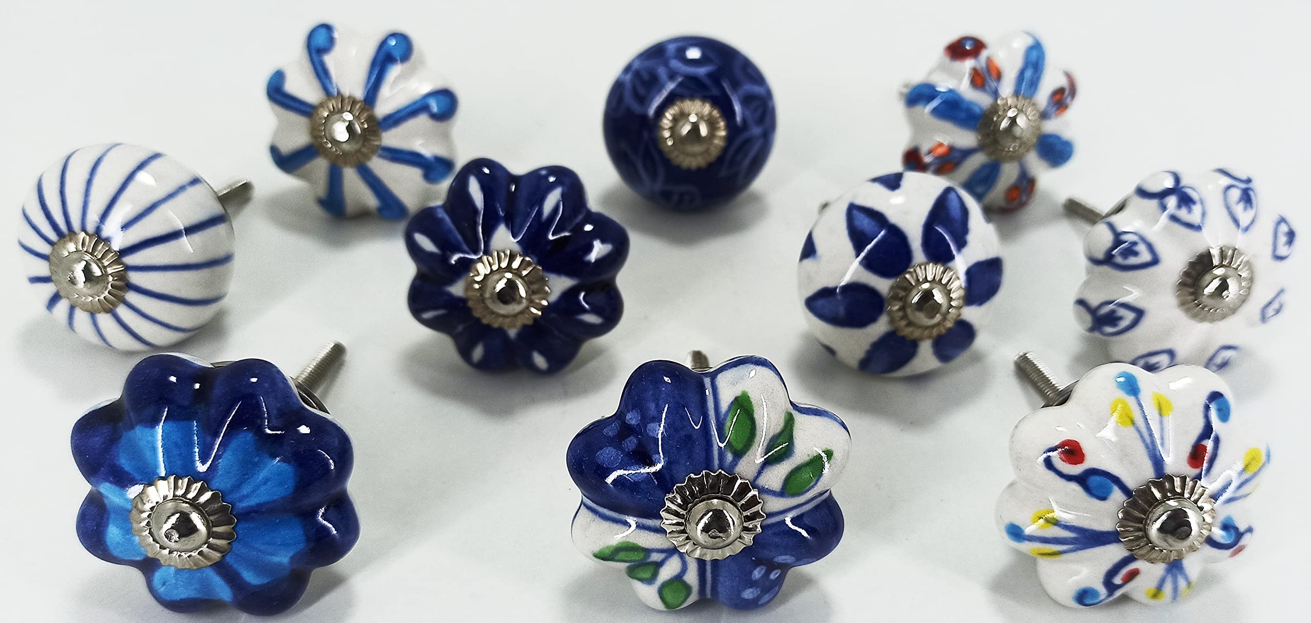 Pomos de cerámica surtidos para gabinetes, tiradores vintage para puertas y cajones, herrajes cromados 01 (juego de 10 pomos, azul