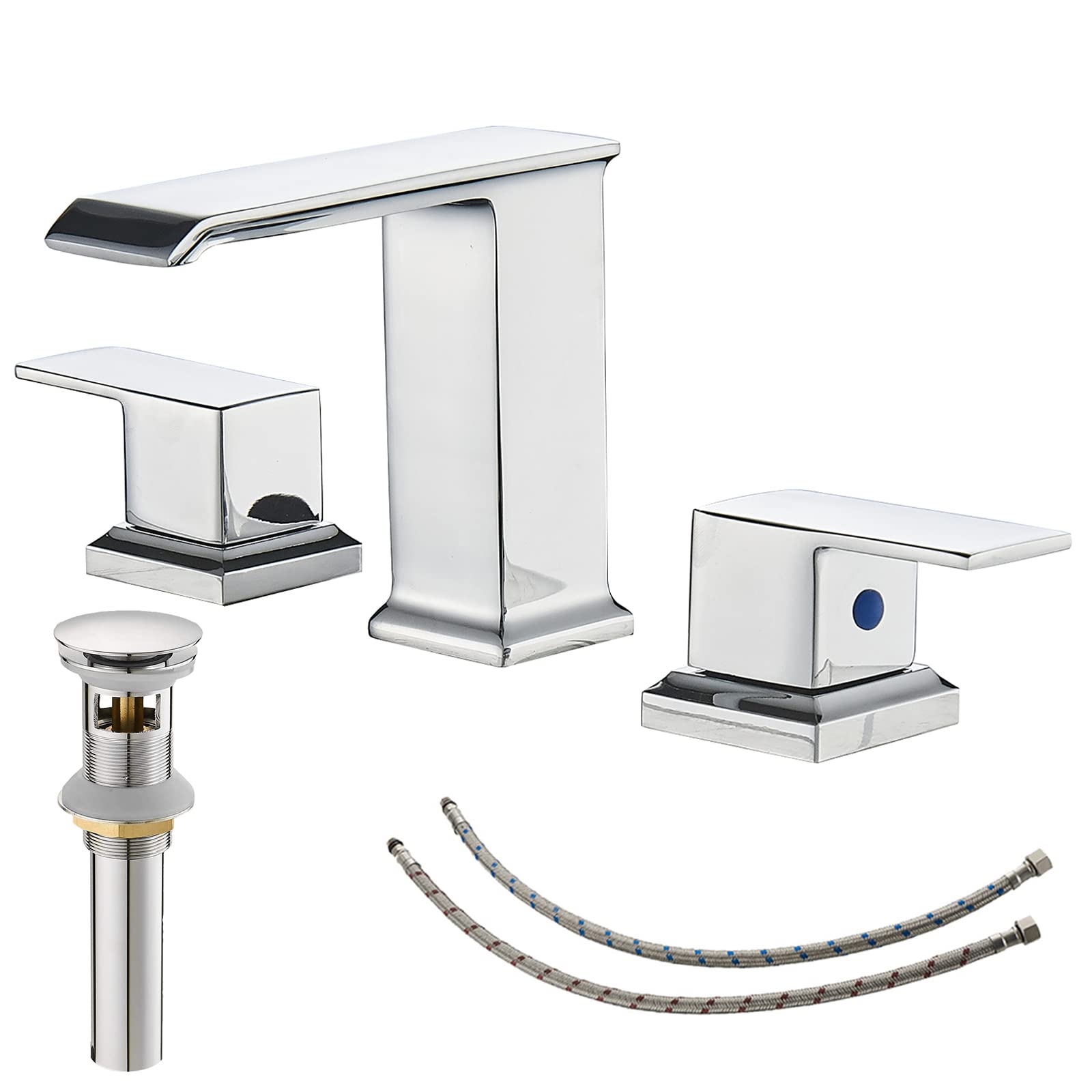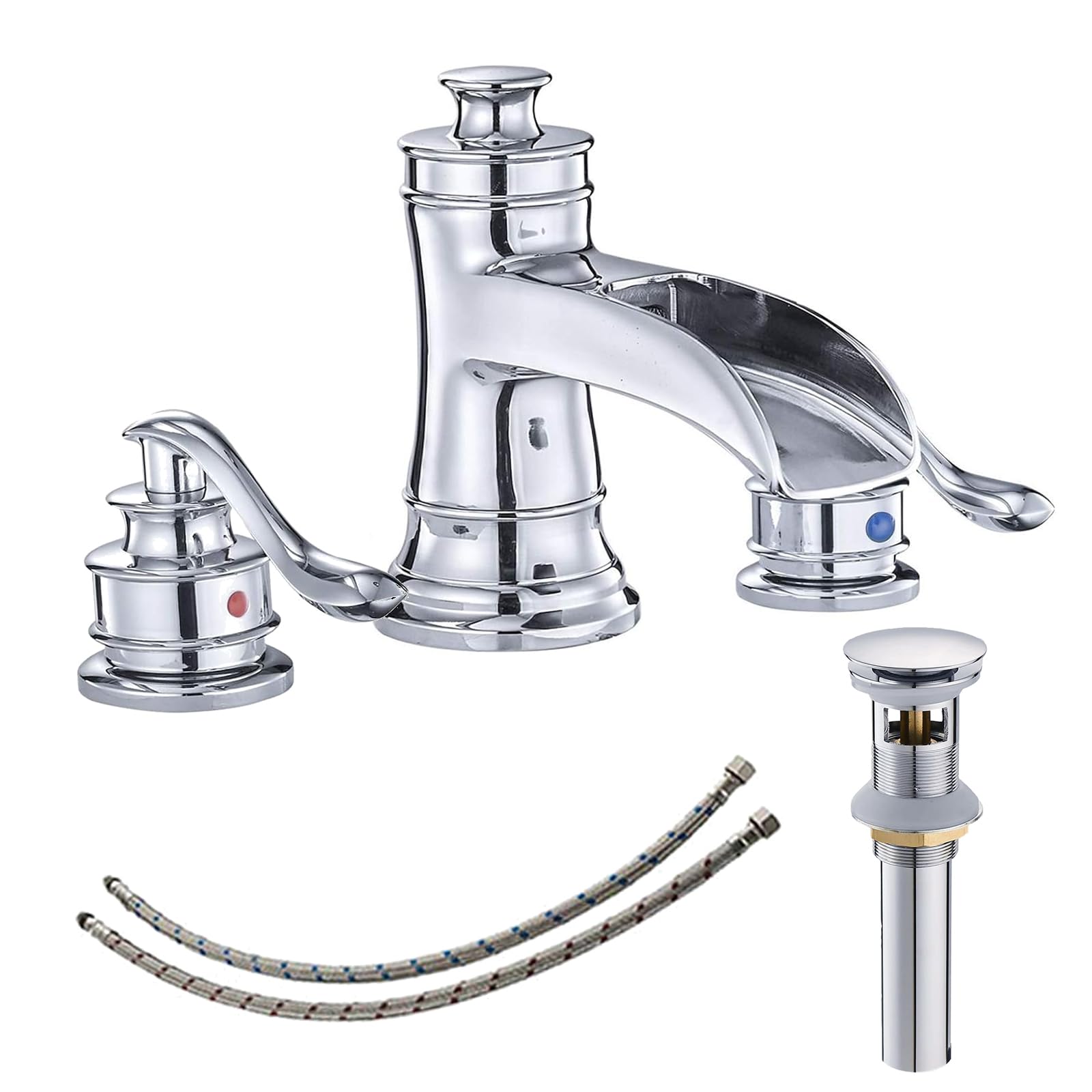 Grifo de baño cromado extendido con cascada, 3 agujeros, 2 manijas, 8 pulgadas, moderno lavabo con drenaje desplegable con desbord