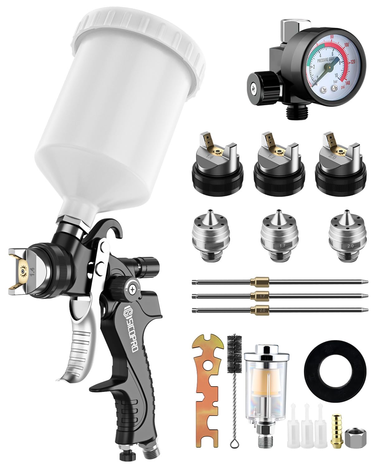 DAXINYANG YT-160 LVLP Kit automotriz de pistolas de pintura con boquillas de 1.3/1.5/1.7/0.079 in y regulador de aire y separador