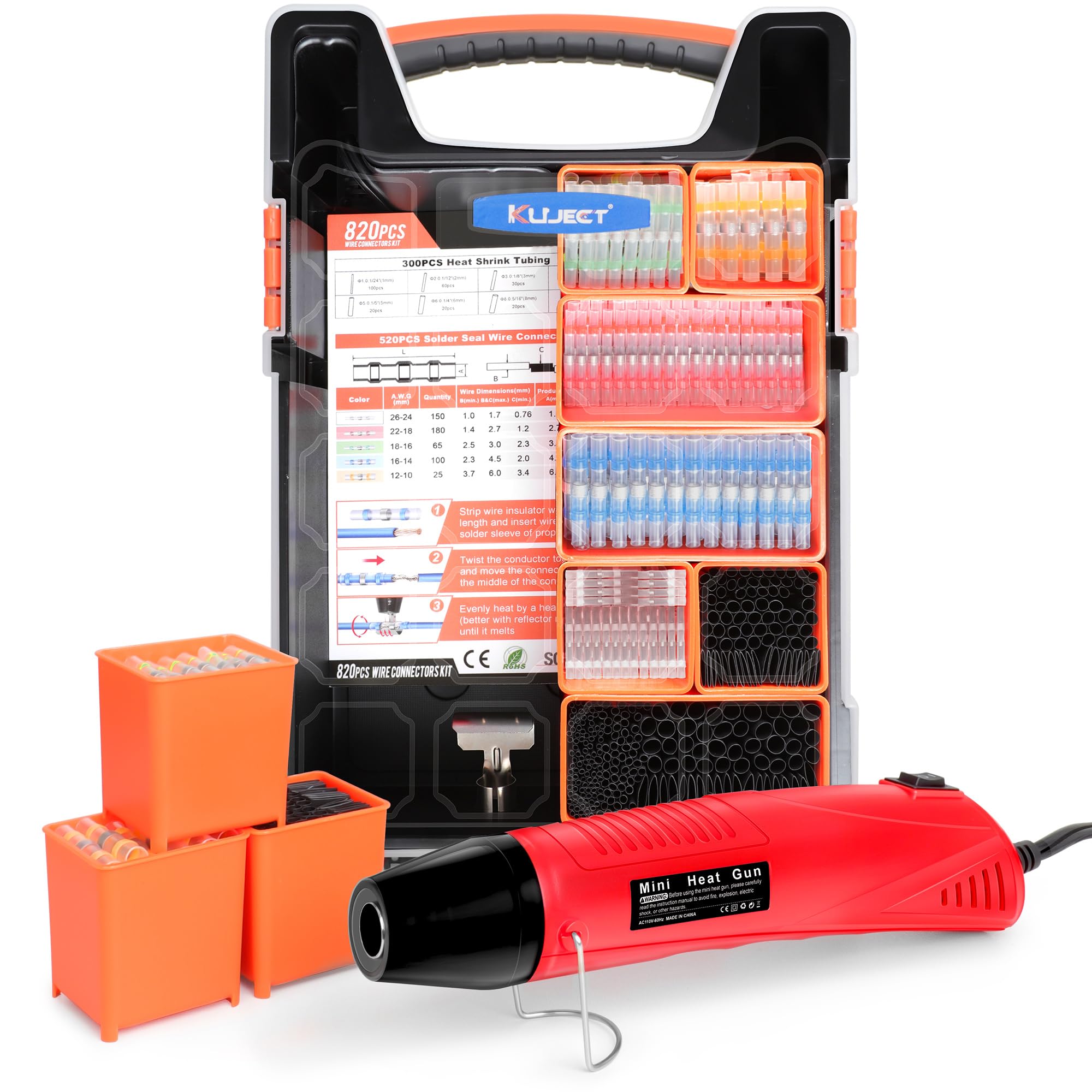 Kuject Kit de conectores de alambre de sellado de soldadura y tubo termorretráctil con pistola de calor y organizadores, conectore
