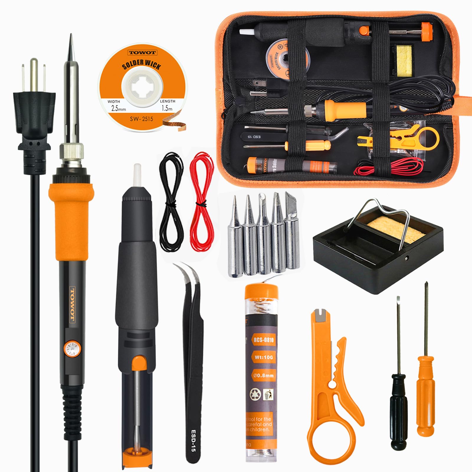 TOWOT Kit de soldador, soldador electrónico 60W temperatura ajustable, bomba de soldadura, alambre de estaño, mecha de soldadura,