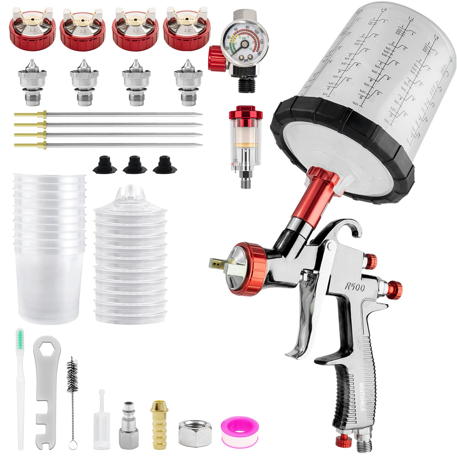 R500 LVLP Pistola de pulverización de aire con 10 vasos desechables de 22.0 fl oz, boquillas de 1.3/1.5/1.7/0.079 in, pistolas de